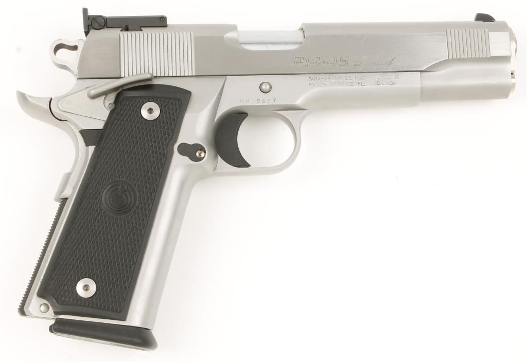 SN:HM9667, Single action semi auto 1911 style pistol made in Canada. Matte stainless steel frame with brushed stainless steel slide, checkered black plastic grip panels, 5" barrel, adjustable rear sight, ambidextrous safety and serrated rear grip strap. Very good bore and action. Includes 1 magazine. Condition: Good to very good showing light scratching from handling.