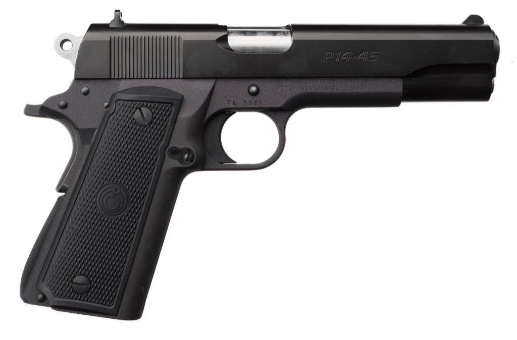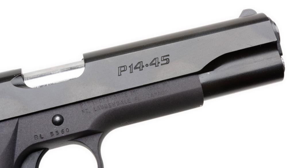 *Para Ordnance Model P14-45 semi-automatic pistol, .45 ACP caliber, serial #RL5560. The pistol is in overall very good to nearly fine condition with a 5” barrel. The pistol retains nearly all of its blued finish with only slight edge wear at the muzzle. The hard plastic, Para Ordnance marked grips are in excellent overall condition showing little use. No magazine is included with the pistol. The bore is very good, the action crisp and markings are sharp on this Para Ordnance. Est.: $300-$600.