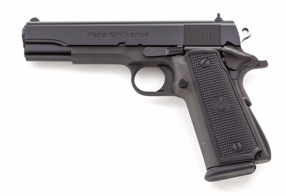 Para-Ordnance Model P16 Semi-Automatic Pistol, #RF4374, .40 S&W cal., 5'' barrel, black slide, matte black frame, factory Para-Ordnance checkered black plastic grips, serrated front and back grip strap, beavertail grip safety, stainless steel hammer, fixed white dot front sight and white two-dot rear sight, with one factory high-capacity magazine. Condition is excellent, appearing near new. Matte surfaces with a few scattered light scuffs from handling, mainly to the grip and thumb safety, as well as two small marks just above the serial number. Action is excellent, bore is bright. Est.: $450-$650. (Modern/PPT) (High cap mags not available to Calif. residents.)