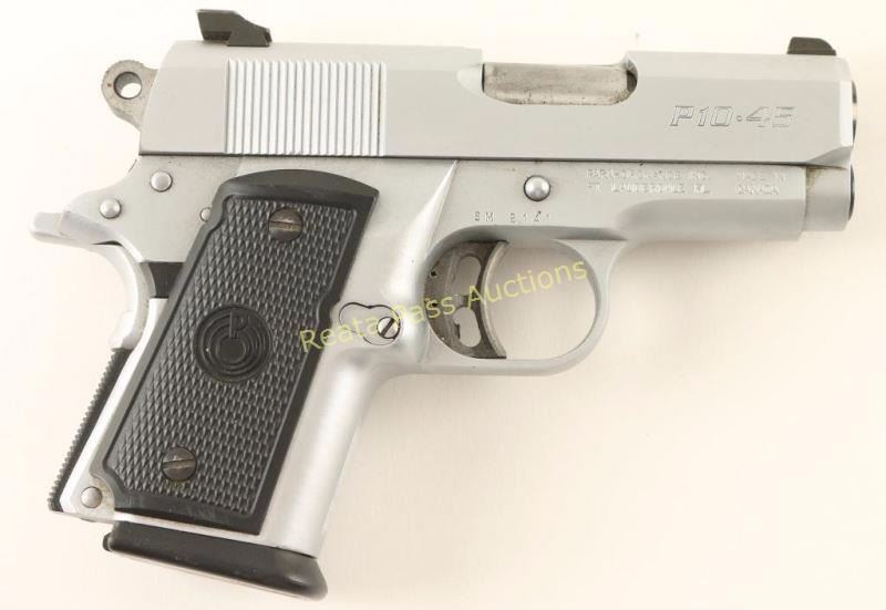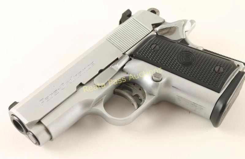 Canadian made compact 1911 style semi-automatic pistol chambered in .45 Automatic. Features a satin silver finish, 3" barrel, three-dot Tru Dot sights, partially serrated slide, wide grip, 10 round double stack magazine, thumb safety, beavertail grip safety, adjustable trigger, serrated round hammer spur, checkered main spring housing and two-piece Para Ordnance black checkered plastic grips. Pistol shows only light handling marks with no major wear observed. Action is crisp, bore is excellent and grips are fine. Condition is excellent. ***Modern Firearm***