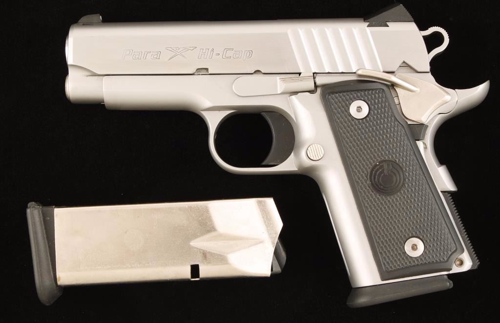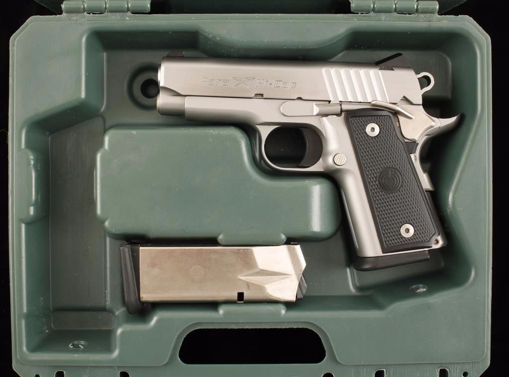 Canadian made compact 'hi-cap' semi-automatic pistol chambered in .45 Automatic Colt Pistol. Features a 3.5" steel barrel, stainless steel slide, satin finished frame, dovetailed front & low-mount rear three dot adjustable sights, thumb safety, beavertail grip safety, skeletonized hammer. serrated trigger, 10 round magazine and checked black hard plastic grips. Includes original case and one extra magazine. Finish shows minor wear with only few superficial scratched observed on slide. Action is smooth and bore is excellent. Condition is near near excellent. ***Modern Firearm***