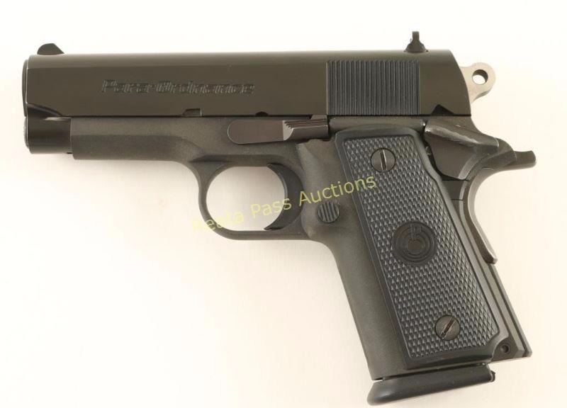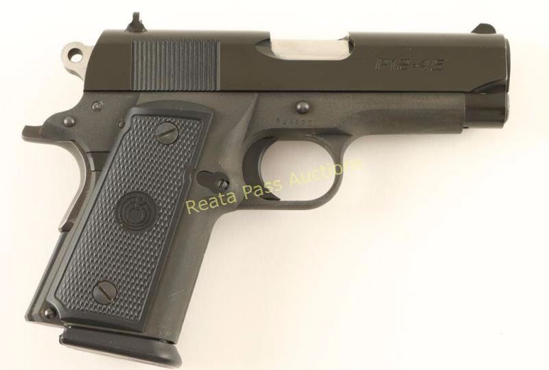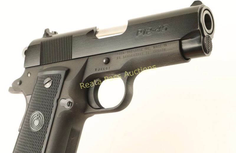 Canadian made double stack 1911-A1 style semi automatic pistol chambered in .45 Auto. Features a black coated slide with rear serrations, 3.5" barrel, three-dot sights, parkerized light alloy frame, serrated trigger, round hammer spur, thumb safety, beavertail grip safety, push button magazine release. 12 round factory magazine, serrated main spring housing and Para Ordnance two-piece checkered black plastic grips. Includes original factory hard case. Pistol show only light holster wear and a few small handling marks. Action is tight, bore is pristine, and grips are fine. Condition is near excellent in box. ***Modern Firearm***