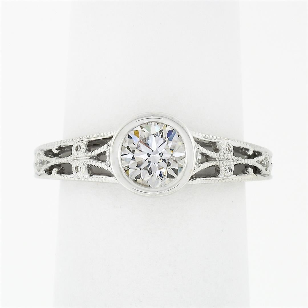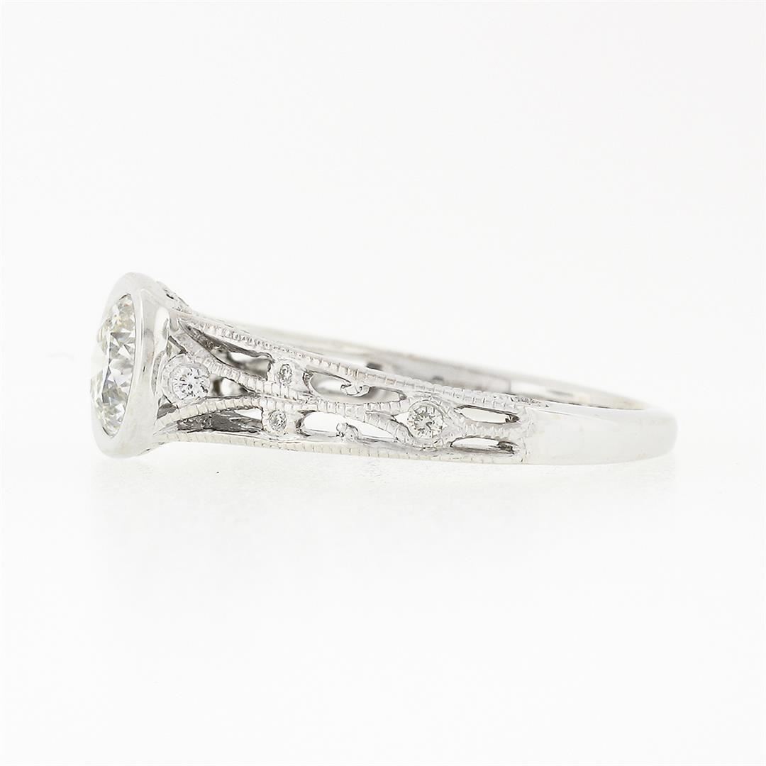 An estate soldi 18k white gold open work engagement ring by Parade, featuring 1 round brilliant cut natural dimaond (G - VS1 ; 0.65ct), accented with 18 round brilliant cut natural diamonds (G/H - VS1/VS2 ; 0.22ctw). The ring is size 5.0, weighs a total of 2.98 grams, and measures 7.05mm wide.