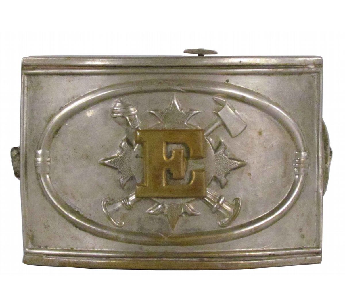 Nickel over brass parade belt buckle from the Erie, PA Fire Department. Embossed torch/axe design with large brass "E".