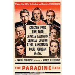 Paradine Case, The (Selznick Releasing Organization, Inc., 1947). One Sheet (27" X 41"). Hitchcock's tale of a lawyer, Gregory Peck, who is called in to defend a beautiful woman accused of murdering her blind husband. The woman's charms distract Peck, who begins to fall in love with her. Fine. Important notice: We expect to be auctioning lots at the rate of 200-250 per hour. Sometimes eBay Premier live bid software cannot keep up with that pace, so we strongly recommend that you place a realistic proxy bid now as insurance to avoid disappointment. Also please note that all Heritage/CAA lots purchased through eBay Premier carry a 20% Buyer's Premium.