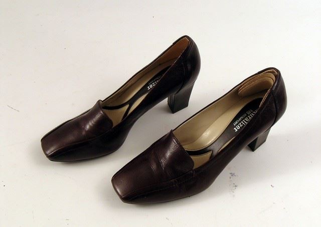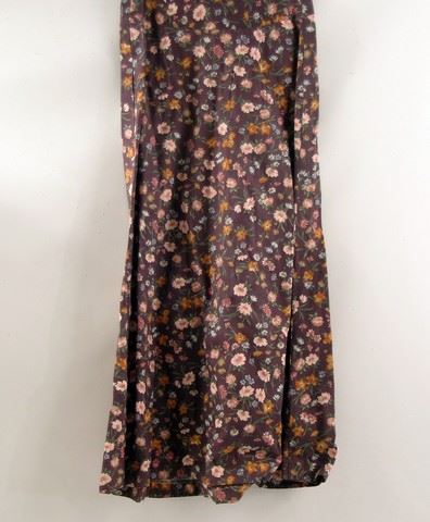 Melanie (Holly Hunter) screen worn, hero, cream three quarter sleeve ruffle cuff floral cut collar 'Byer' shirt, (size M) dark purple floral pattern zipper back skirt, and brown leather slip 'Naturlizer' wedge heels. (size 7) Includes wardrobe tag!