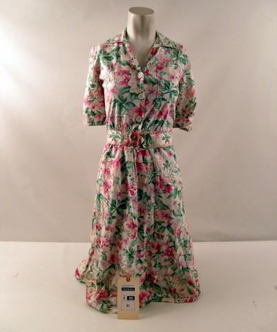 Melanie (Holly Hunter) screen worn, hero, cream, mint, green, rose, and light lilac floral print short sleeve cuffed sleeve dress with self belt. (no label or size) Includes wardrobe tag!