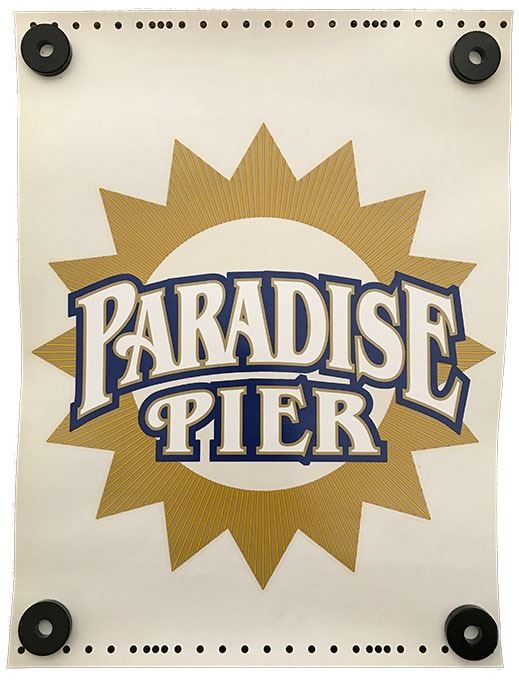 (Disney California Adventure, c. 2000's). A rare and retired park prop decal for the former DCA land of Paradise Pier. Decals like these were regularly used on props in the park like trash cans. This is an unused decal as Paradise Pier was closed in 2018 to make way for Pixar Pier & Paradise Gardens Park. A wonderful nostalgic remembrance of an original major land of Disney California Adventure Park. The decal is unused and in good condition with normal wear from age and minimal handling. The decal measures approximately 11" x 11". Item comes with a Grand Circle Tour Auctions COA.