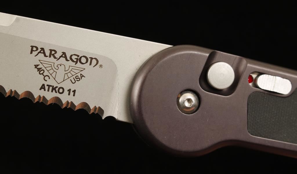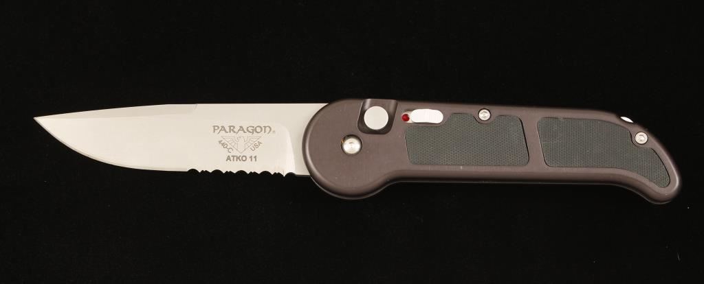 Features 3.5" 440C partially serrated blade, switch safety & a fold away lanyard loop. Shows minor wear and one of the rubber grips is starting to peel up.