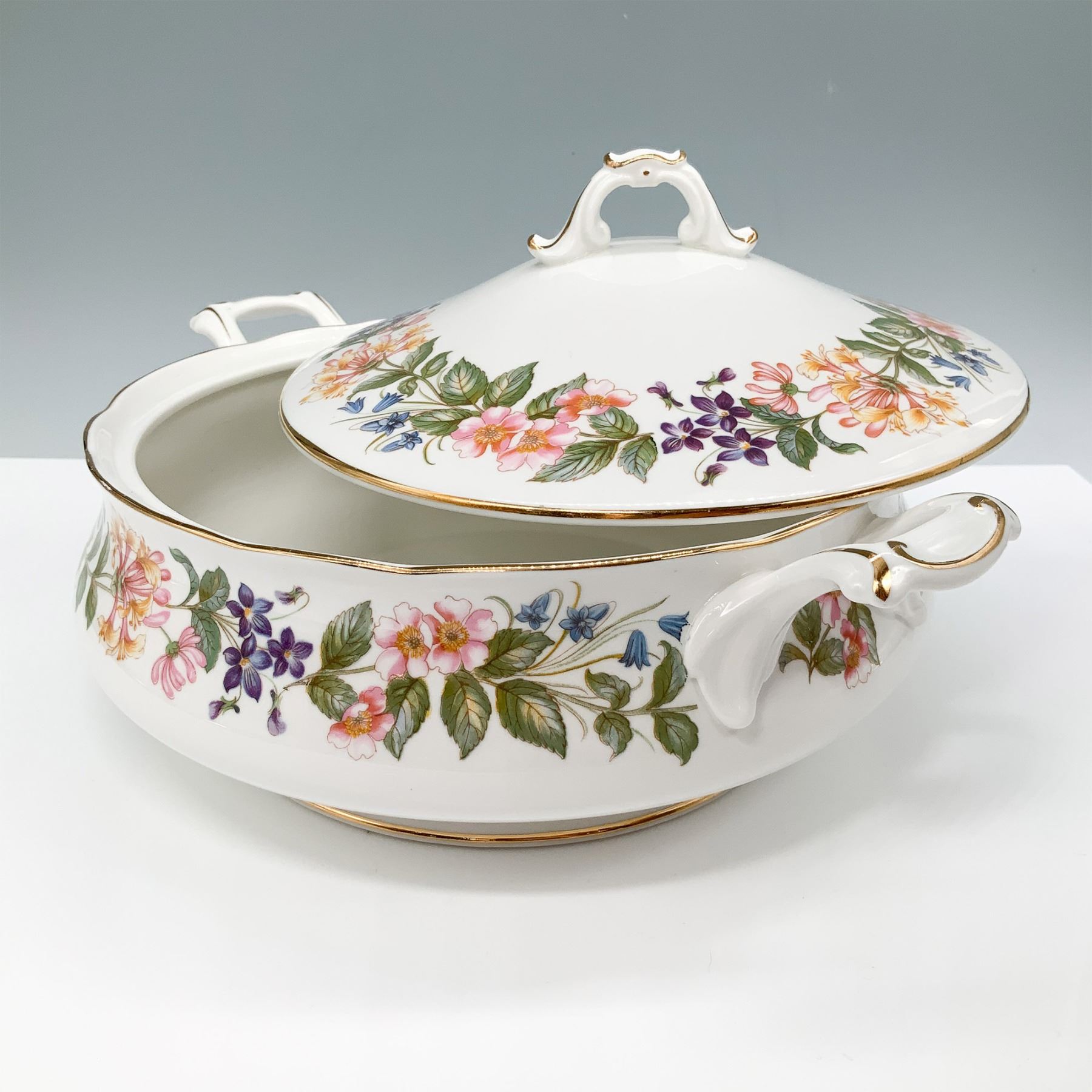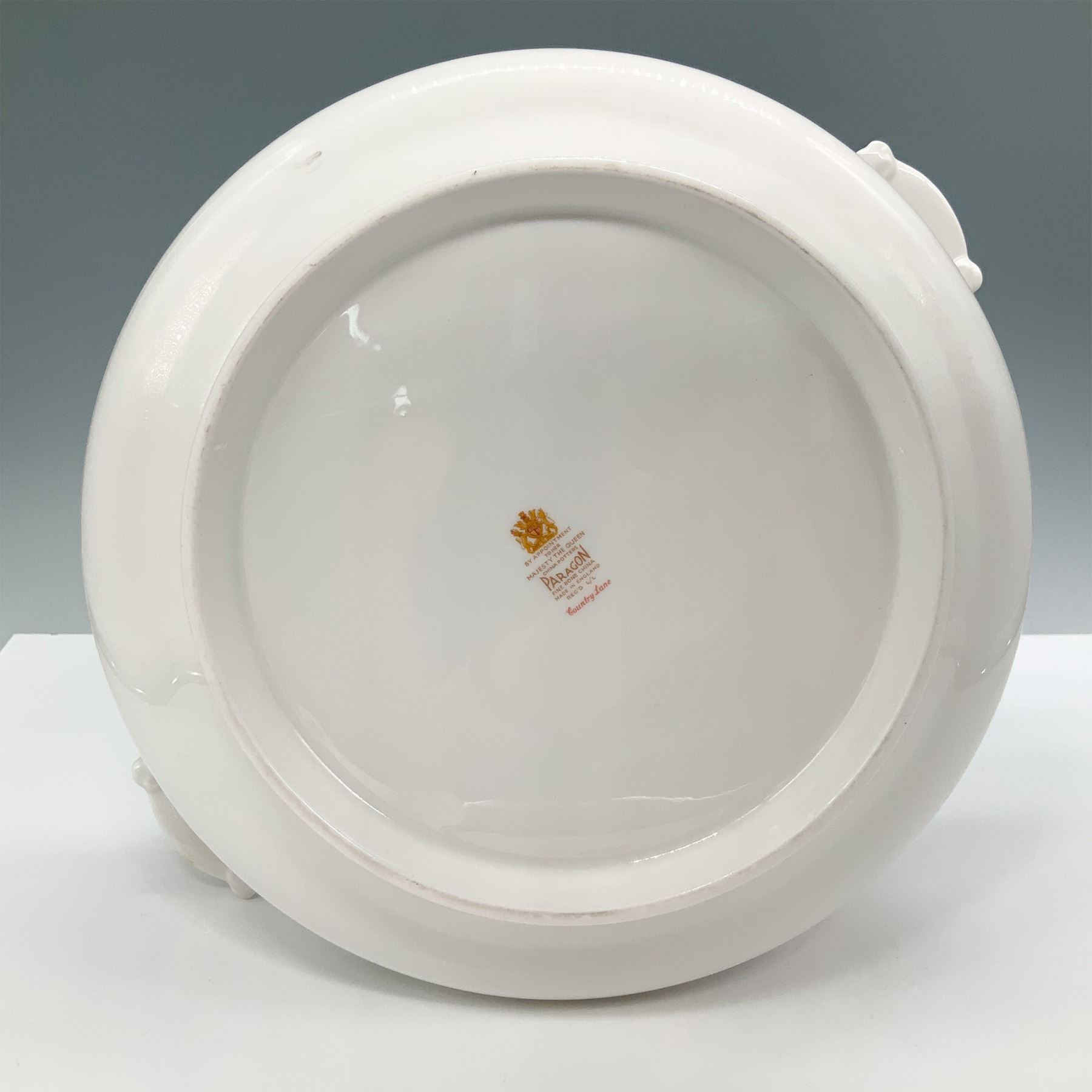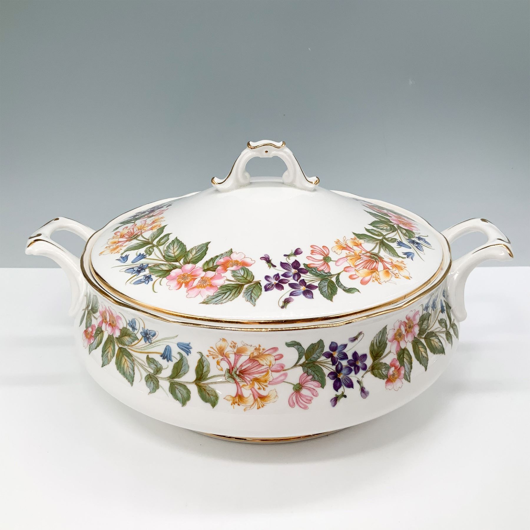 Paragon Country Lane fine bone china covered dish featuring a detailed floral pattern with colorful blossoms and lush green foliage. The dish is elegantly accented with gold trim along the rim, handles, and lid. The ornate handles and finial add to its sophisticated appeal. Marked on the underside with the Paragon backstamp, indicating English origin and a royal warrant. A beautifully crafted serving piece, perfect for collectors of fine china.