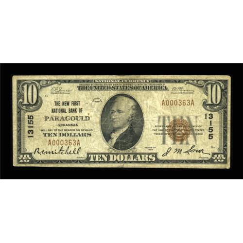 <B>Paragould, AR</B></I> - $10 1929 Ty. 1 <B>The New First NB</B></I> Ch. # 13155<BR> This was considerably the scarcer of Paragould's two Series 1929 issuers, with offerings from here few and far between. <B>Very Good-Fine.</B></I><BR><BR><b>Shipping:</b> Coins & Currency (<a target="_blank" href="http://www.heritageauctions.com/common/shipping.php">view shipping information</a>)