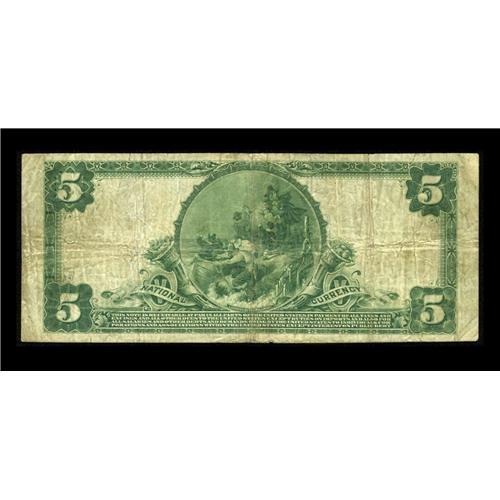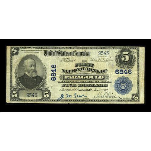 <B>Paragould, AR</B></I> - $5 1902 Plain Back Fr. 598 <B>The First NB</B></I> Ch. # 6846<BR>This is by far the scarcest of Paragould's three issuing banks, with this institution circulating only large size examples. The census stands at just five, one Red Seal (which has been ensconced in a major collection since its last appearance in 1989) and four Blue Seals, one of which is this specimen. Our records show only three appearances of any kind from here at public sale, with the last coming when the aforementioned Red Seal was sold back in 1989. Nice <B>Fine-Very Fine,</B></I> with two color pen signatures.<BR><BR><b>Shipping:</b> Coin/Currency (<a target="_blank" href="http://www.heritageauctions.com/common/shipping.php">view shipping information</a>)