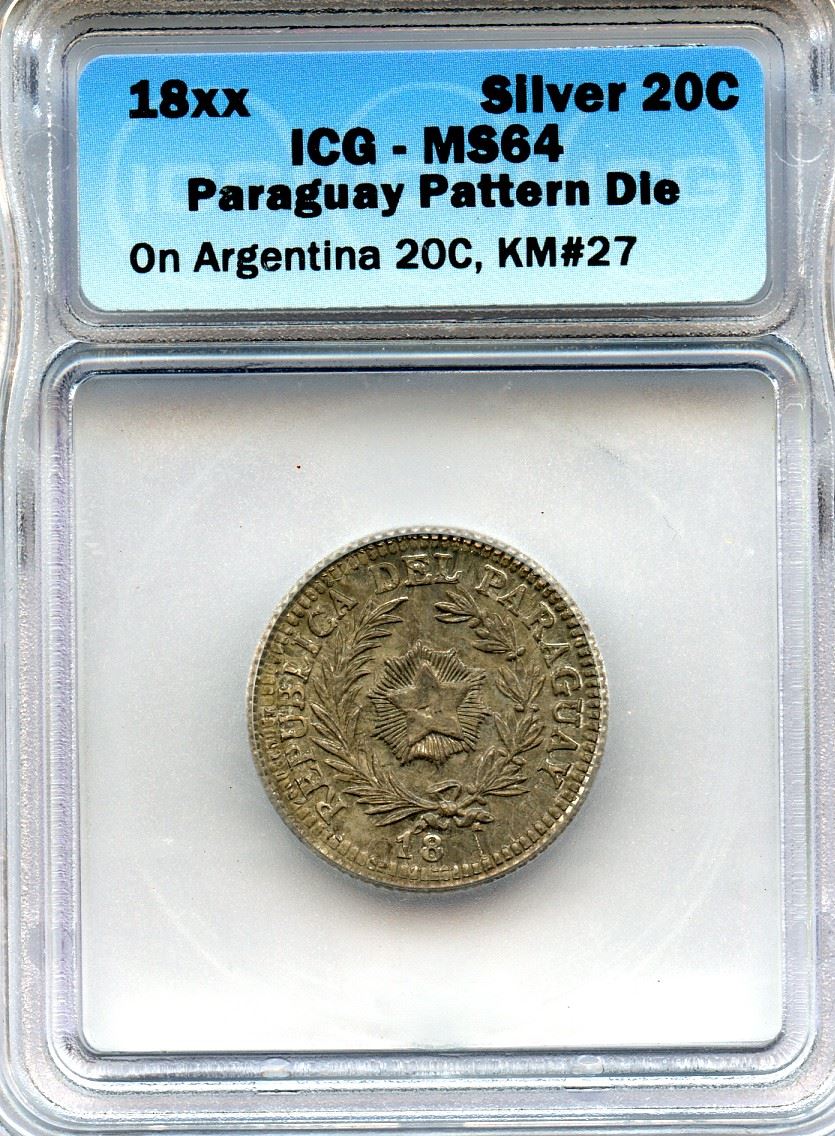Paraguay 18xx, Silver 20 Centimos (struck on a 20 Centavos from Argentina) , Only the first 2 digits are in the date, A Pattern or test issue, Very rare, Certified by ICG as MS-64