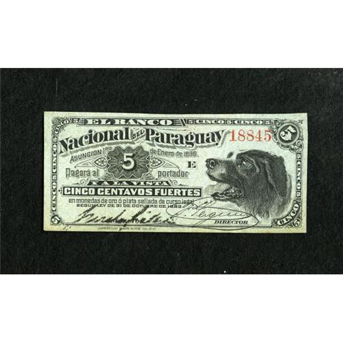 <B>Paraguay </B></I>5 Centavos 1886 Pick S141<BR> This Series E note has a light residue on its bottom margin. This note is usually not found at this grade level. <B>Extremely Fine.</B></I><BR><BR><b>Shipping:</b> Coins & Currency (<a target="_blank" href="http://www.heritageauctions.com/common/shipping.php">view shipping information</a>)