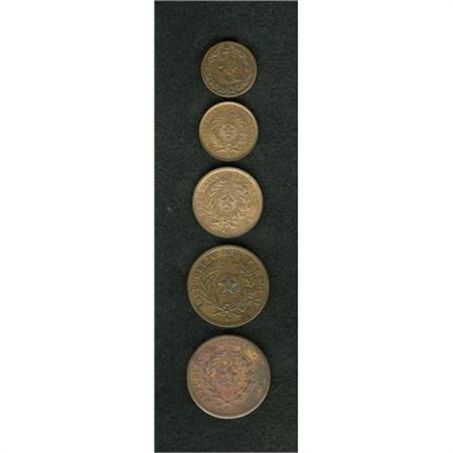 <B>Republic Early Copper Types,</B></I> KM1.2 1/12 Real 1845, crude issue struck at the Asuncion Mint in medal rotation, nice F-VF, KM2 Centesimo 1870, prooflike BU, superb Specimen from the Heaton Mint Collection, KM3 2 Centesimos 1870, also a choice Heaton specimen strike, KM4.1 4 Centesimos 1870, glossy brown XF, and KM4.2 4 Centesimos 1870, Asuncion Mint striking without SHAW, crude XF or better, scarce type and grade, typically coarse surfaces. <B>Sold as is, no return lot.</B></I><BR><BR><b>Shipping:</b> Coins & Currency (<a target="_blank" href="http://www.heritageauctions.com/common/shipping.php">view shipping information</a>)