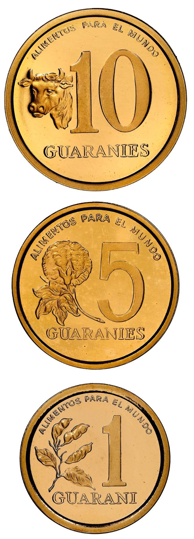 Paraguay (struck in Brazil), gold proof denomination set, 1978, rare: 10 guaranies, NGC PF 67 Ultra Cameo; 5 guaranies, NGC PF 67 Ultra Cameo; 1 guarani, NGC PF 69 Ultra Cameo. KM-Ps10. Lovely lustrous proofs in rich red gold, only ten sets struck so quite rare from the outset, first set we have seen offered in a decade.