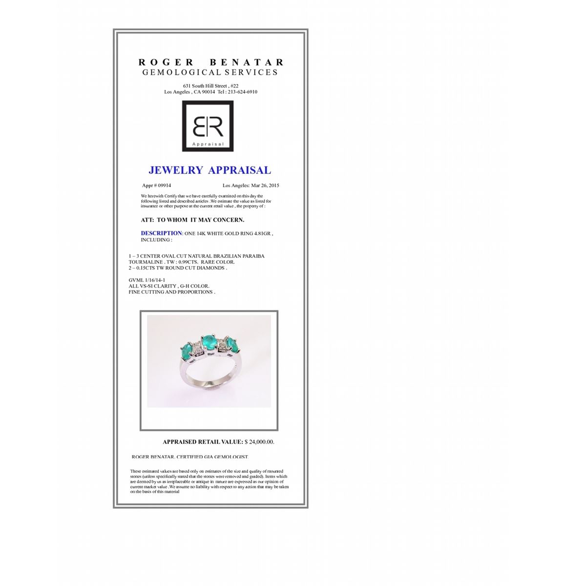 14k White Gold, Paraiba Tourmaline .99ctw Excellent Oval Cut Excellent Turquoise color in Paraiba Rare Stones, .15ctw Round Diamond G-H color VS-SI clarity, Appraised Retail Value $24,000.00