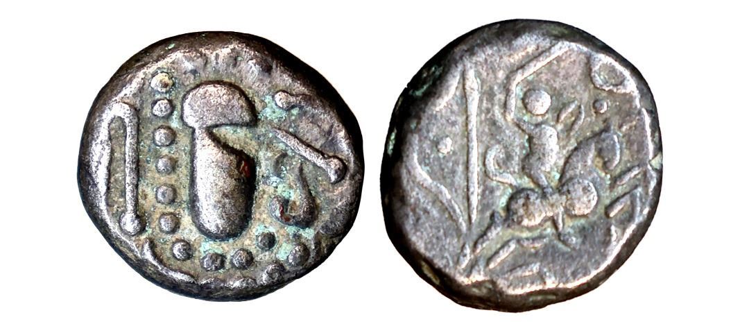 Paramaras of Malwa, (13th Century AD), Gadhaiya Series, Billon Unit, 4.23 gms, War Scene type, Deyell # 167, very fine, scarce.