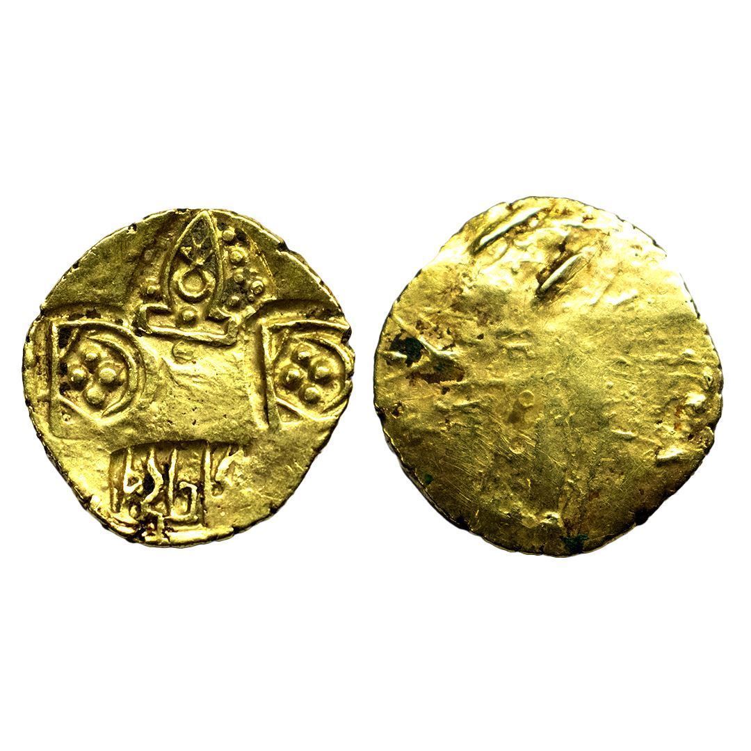 Paramaras of Vidarbha, Jagadeva (12 Century CE), Punch Marked Gold Pagoda, Obv: punch marks including one bearing temple depiction of a human figure, possibly lord Shiva, Nagari legend & quot;Shri Jagadeva& quot;, two punches of geometric & #39;D& #39; symbols, Rev: uniface, JONS. 200 Article by Bankar & amp; Somkuwar, extra fine, rare.