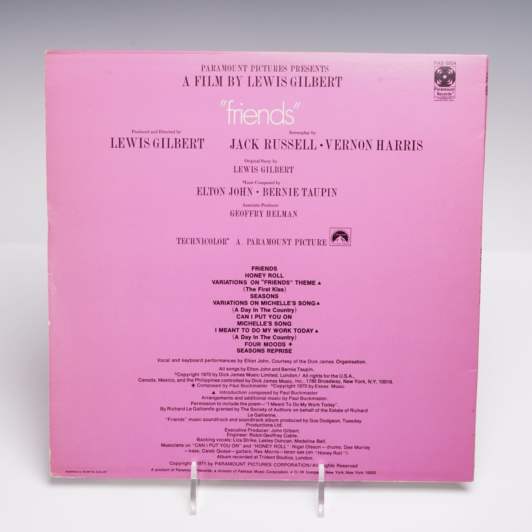 This original 12-inch vinyl soundtrack recording features Elton John' 1971 album Friends, composed in collaboration with lyricist Bernie Taupin for the Paramount Pictures film directed by Lewis Gilbert. the LP includes a collection of thematically cohesive tracks such as "Honey Roll," "Seasons," "Michelle's Song," and the eponymous "Friends." The album's visual presentation is marked by a distinctive pink cover adorned with stylized line art depicting two figures in an intimate moment, while the reverse offers detailed film credits and a full track listing, interwoven with narrative titles such as "Variations on 'Friends' Theme (The First Kiss)' and "I Meant to Do My Work Today (A Day in the Country)."