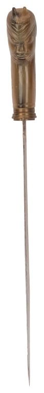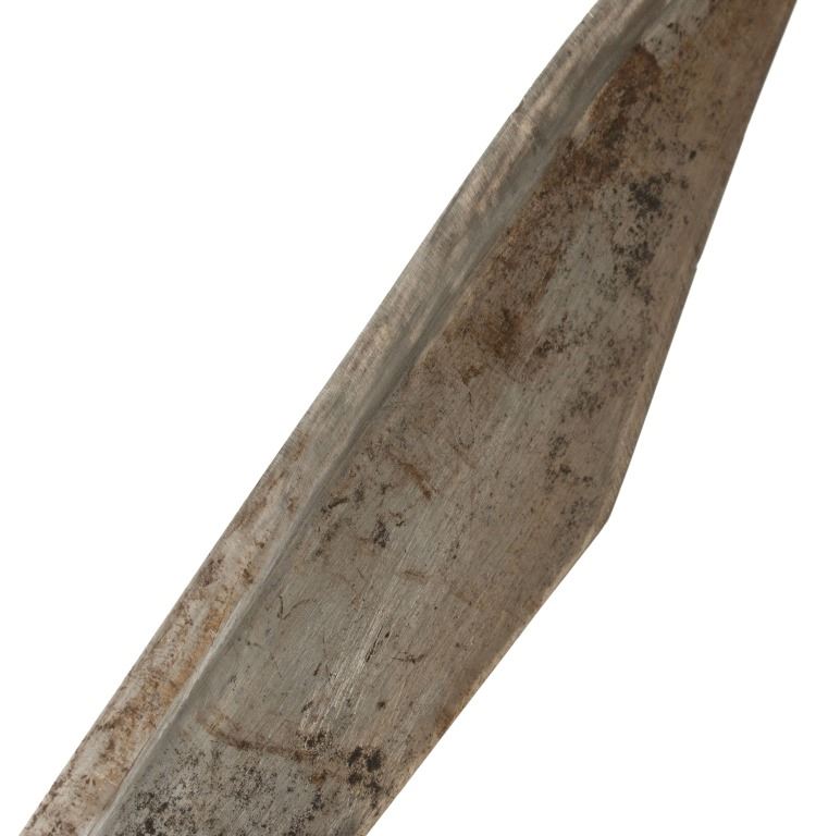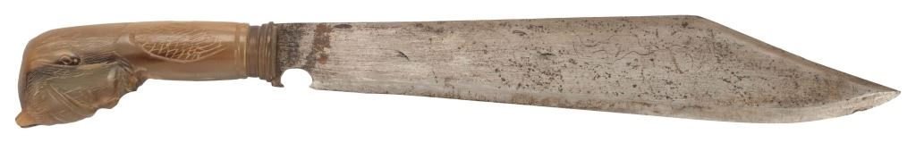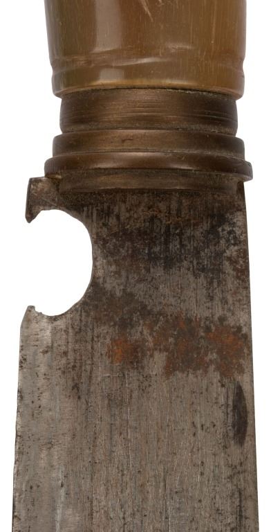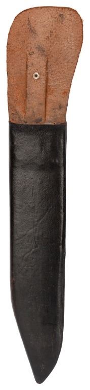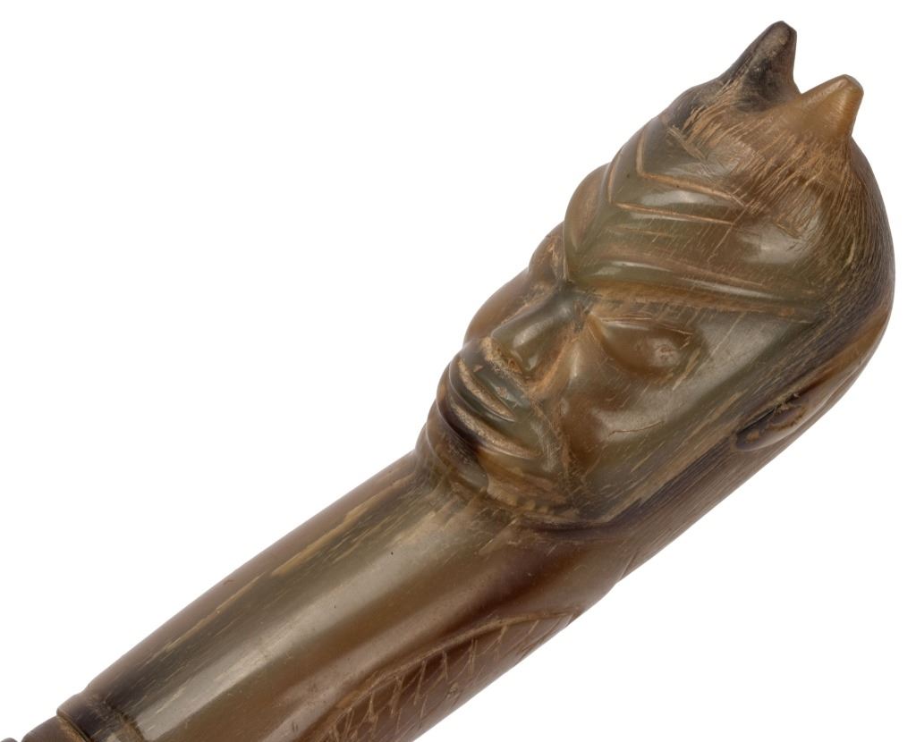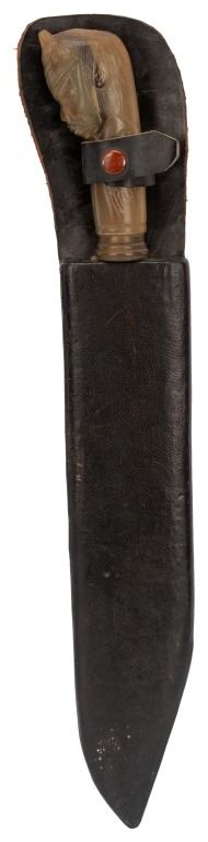 Item/Description: Indonesian knife with carved handle, depicting the bust of a figure with horns. Notch at top of blade. Black leather sheath. (Java, Kris, Keris, Dagger)