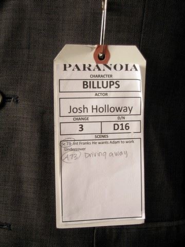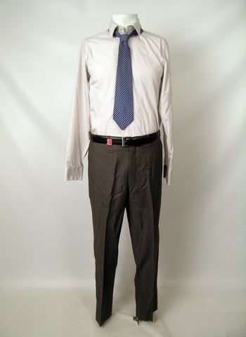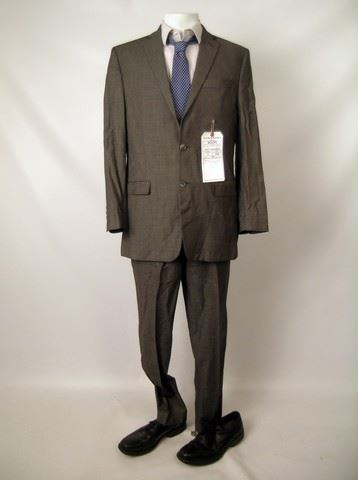 Agent Billups (Josh Holloway) screen worn, hero, grey two button textured 'Calvin Klein' suit jacket and pants, (pants size 34) black leather 'Bosca' belt, (size 36) light grey with thin vertical stripes 'Calvin Klein' shirt, (size 15 1/2 x 34/35) navy blue with light blue confetti squares neck tie, and black leather lace up the front Oxford 'Bostonian' shoes. (size 12) Includes wardrobe tag!
