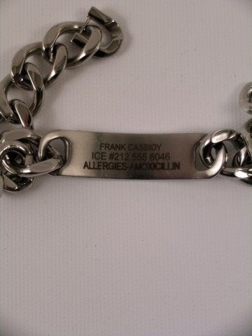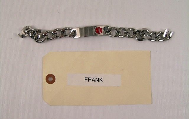 Frank (Richard Dreyfuss) screen used, hero, metal emergency bracelet with information on the back. Includes prop tag.