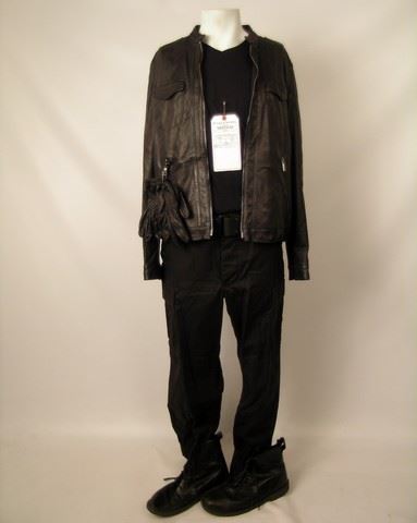 Meechum (Julian McMahon) screen worn, hero, black leather zipper up the front with zipper pockets 'John Varvatos' jacket, (size 56) black v-neck 'Calvin Klein' t-shirt, (size L) leather gloves, black 'Propper' utility pants, (size M) black military style belt, and black leather lace up the front 'Clarks' boots. (size 13) Includes wardrobe tag!
