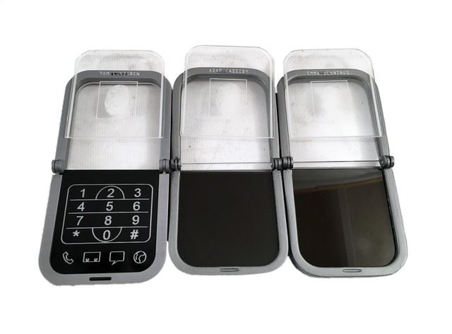 Tom Lungren (Kevin Kilner) screen used, hero, metal with blue LED lights flip up futuristic cell phone with plastic screen, two with no keypads cell phones, three screens, and black case. (approx. 5" x 2 1/2" open)