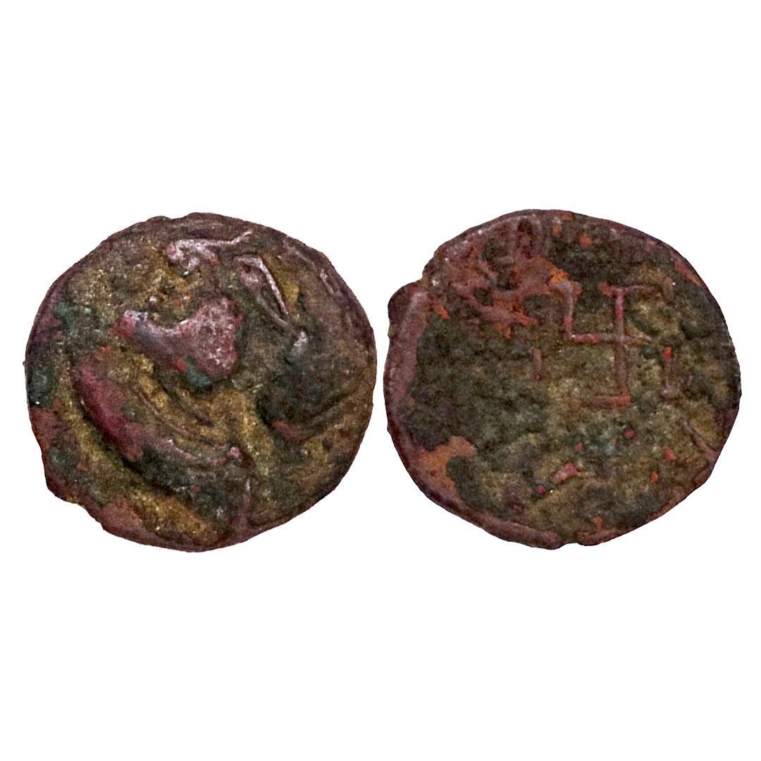 Paratarajas, Koziya (c. 270-230 BC), Copper Drachma, 1.66gms, Obv: Bust of king with wearing crown facing to left side, Rev: Swastika in center around Kharoshti legend. (Tandon # JONS 204).Fine, Scarce.
