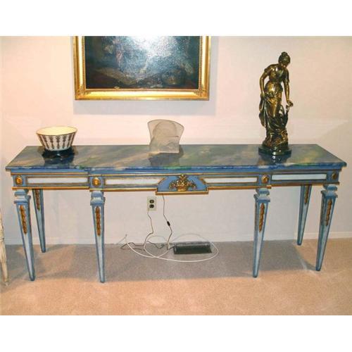 Superb parcel gilt Empire style pine and faux marble buffet side table with impressive use of rich green blue and gilt colors this side table would make a great addition to any fine household or restaurant.