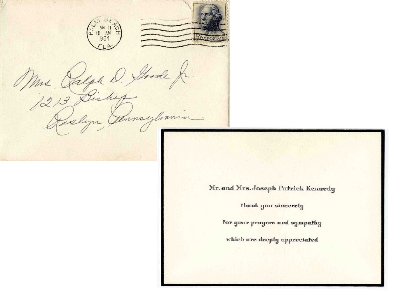 Joseph & Rose Kennedy printed thank you card, expressing thanks for condolences sent after JFK's tragic death. Postmarked from Palm Beach, Florida on 11 January 1964, card reads: ''Mr. and Mrs. Joesph Patrick Kennedy thank you sincerely for your prayers and sympathy which are deeply appreciated''. Envelope is addressed in cursive to a Mrs. Ralph D. Good Jr. in Roslyn, Pennsylvania. Cream colored card with elegant black font and trim measures 5.25'' x 3.75'', in fine condition.