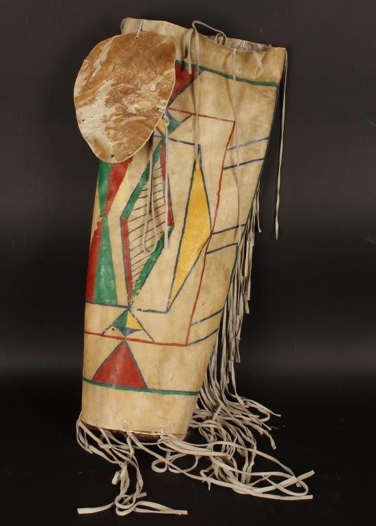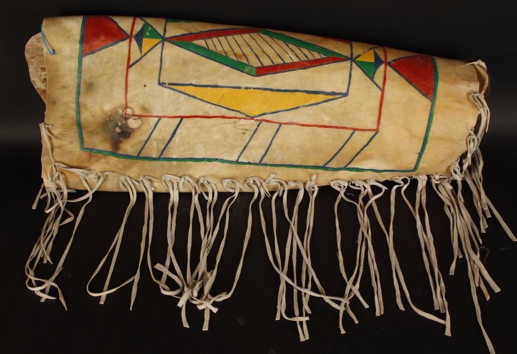 Rawhide construction, hand painted with fringe accents, measures 26"x12".
