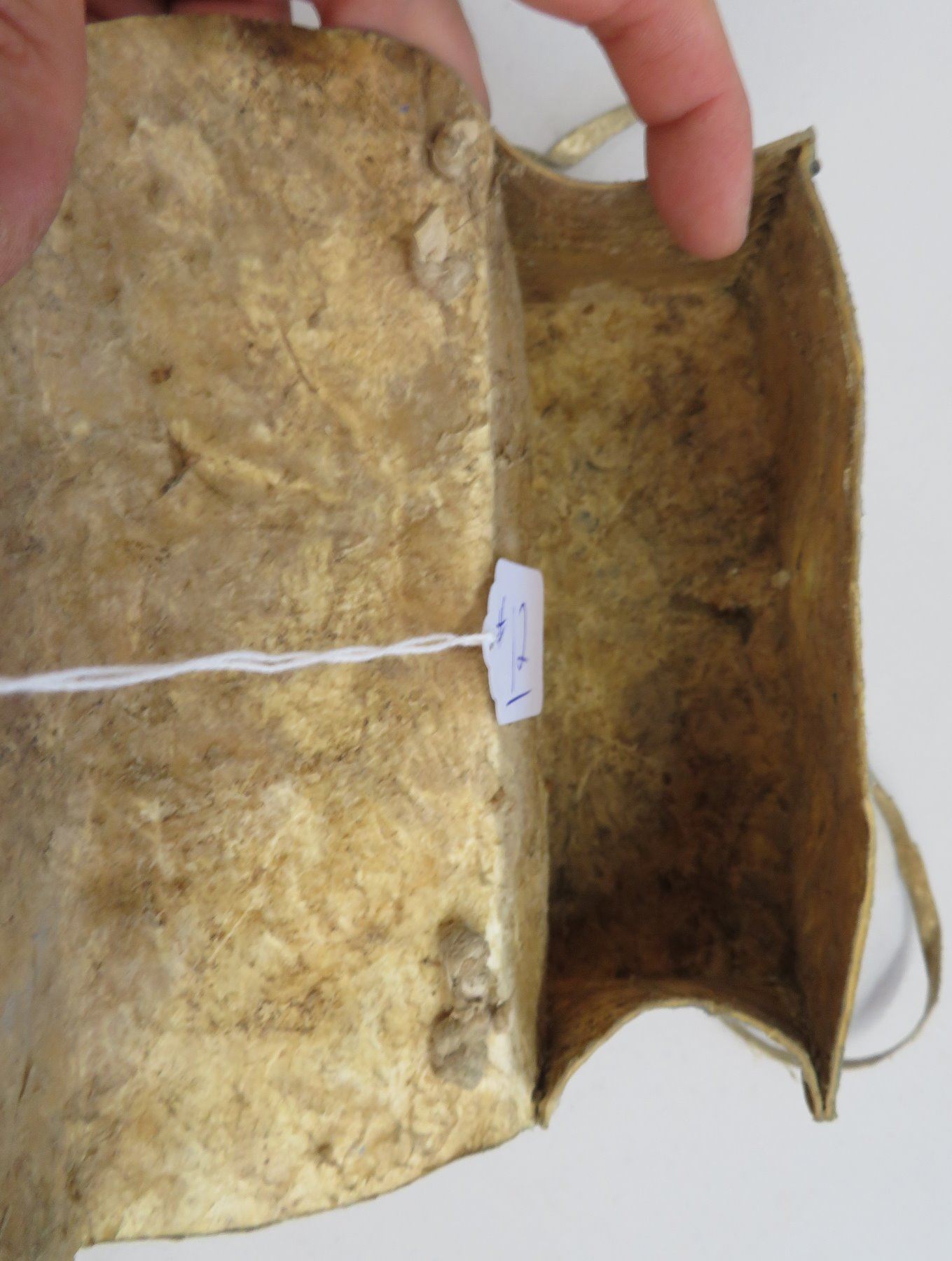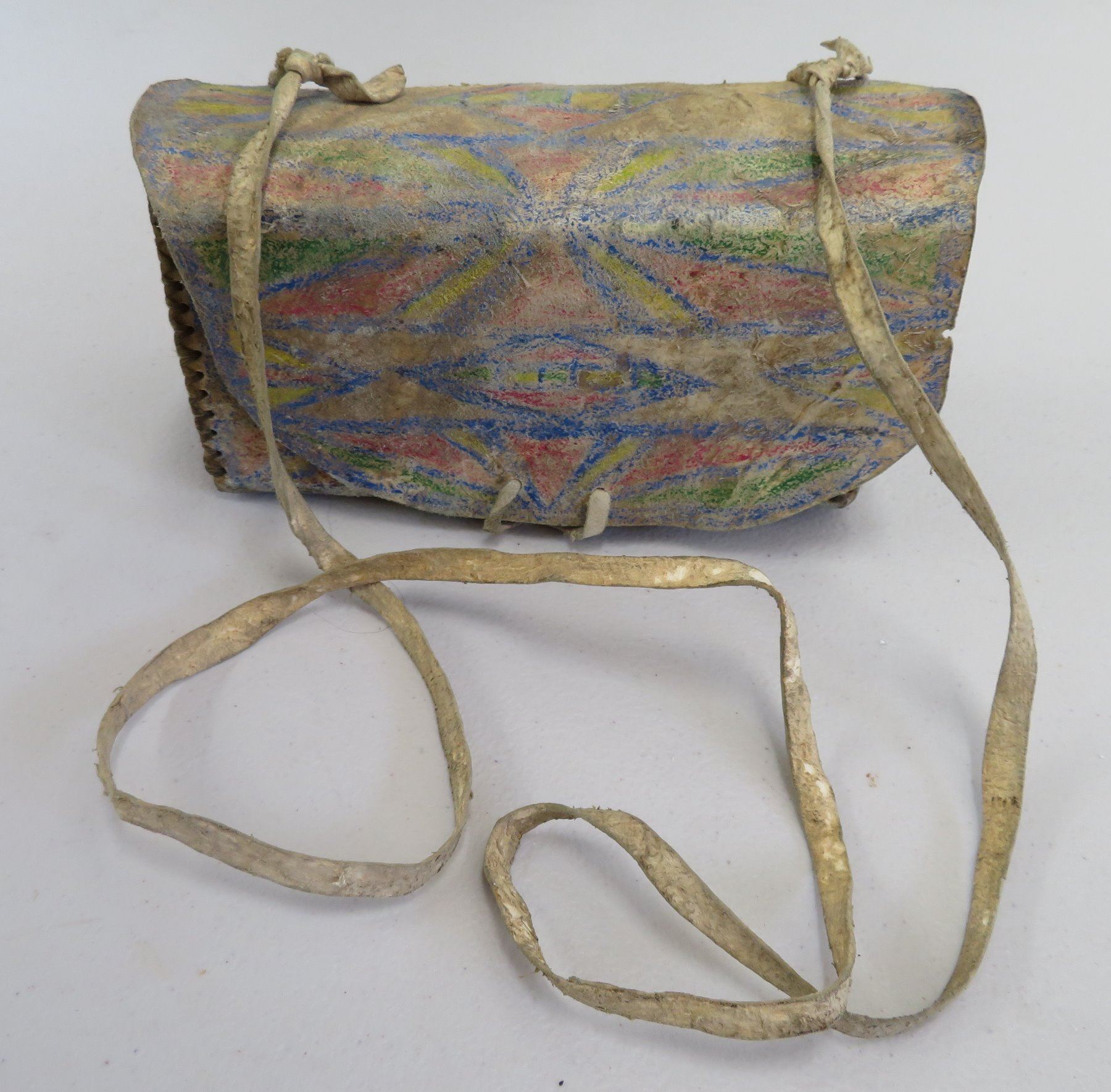 Parfleche Box, c. late 19th century. Made of rawhide/parfleche, paint-ochre and brain-tanned buckskin, the item measures 7" x 4" x 3" with a 36" carrying strap. Central Plains, Sioux, Cheyenne, Arapaho. Condition: Good, heavy use, good patina, see images. Shipping: $24.50 w/insurance and signature, due to value.
