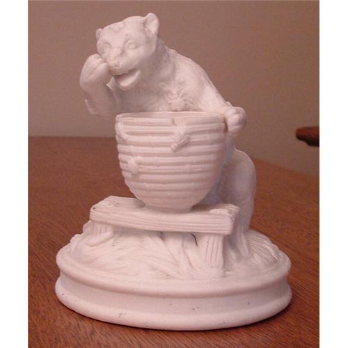 Sweet little Parian bisque figure of a bear with a honey pot. Bees circle his head and one lands on his nose. 19th century. 4.5 inches in height.