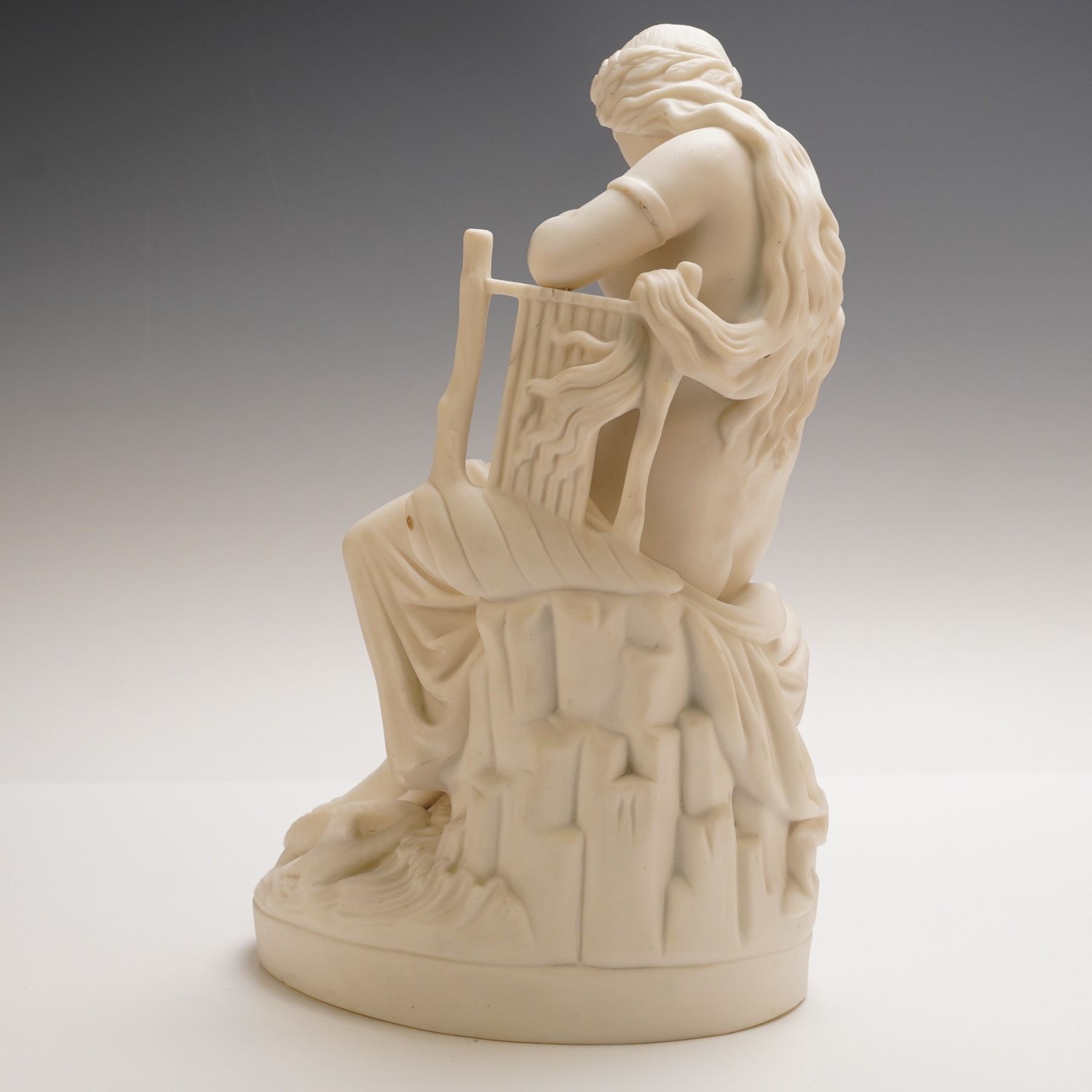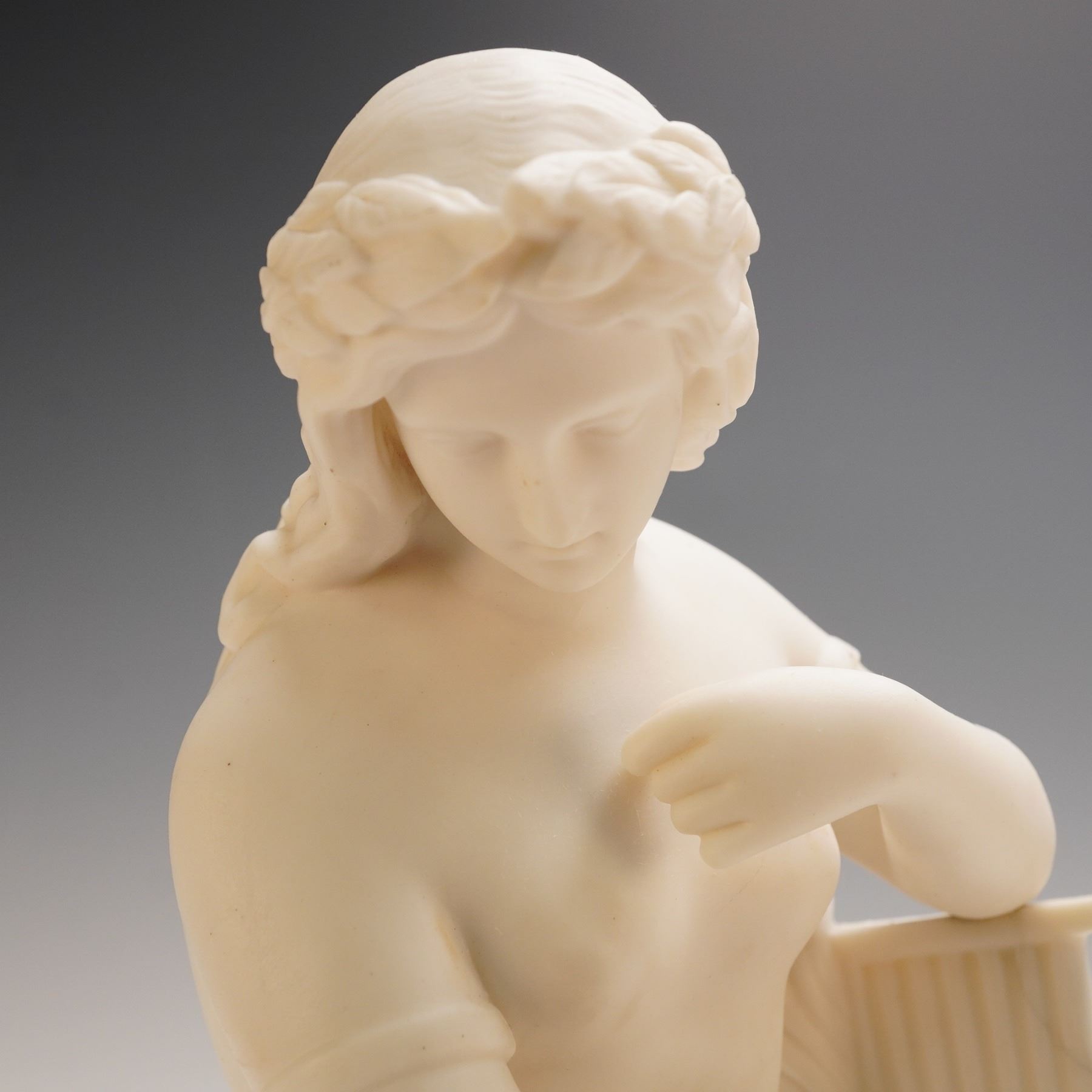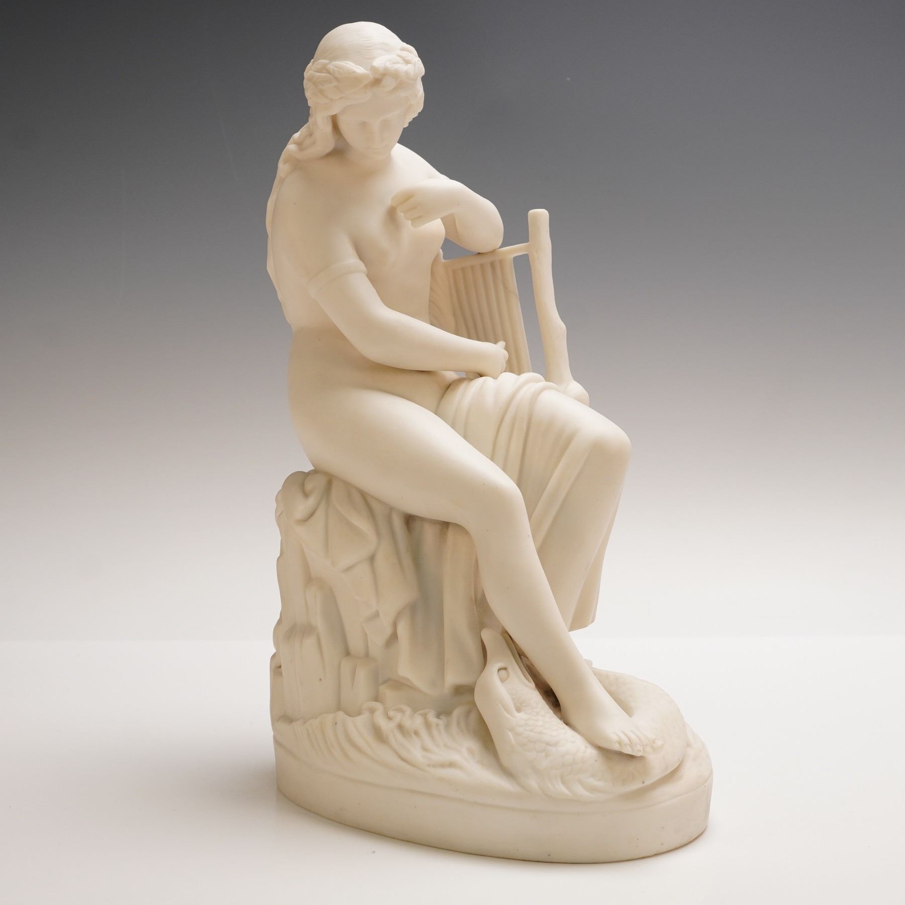 A finely modeled 19th-century Parian figure of Lurline, the Rhine water-nymph of German legend, shown seated beside a swan and holding a lyre. Draped in classical attire with long flowing hair and a garland crown, she is posed in serene contemplation upon a rocky base with wave and feather details. This figure is a reduction of the 1841 marble sculpture by W.K. Schwanthaler, originally commissioned for Prince Schwarzenberg of Vienna. The original marble remains at Castle Anif in Salzburg, with other notable versions at Somerleyton Hall, Suffolk and in bronze at Munich. The Parian version is illustrated in The Parian Phenomenon, page 147, fig. 505, and also featured in Robert Copeland's Parian: Copeland's Statuary Porcelain, fig. S98 - attesting to its popularity and sculptural refinement.