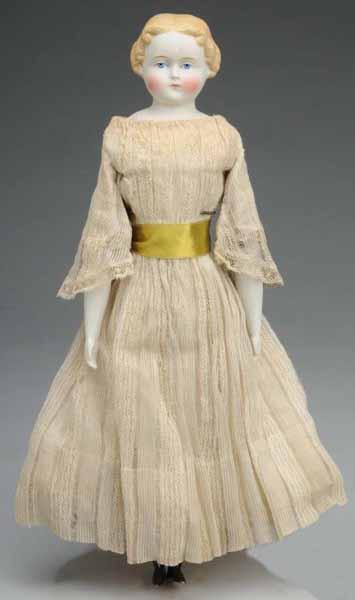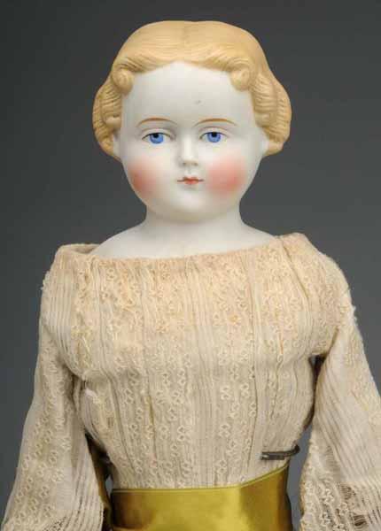 Description Germany, Ca. 1860. Bisque shoulder head with molded blonde curls, blue painted eyes with black eyelash line, red eyelid line and tapered brown eyebrows, closed mouth, rosy cheeks. Antique cloth body with parian lower arms and legs with painted black boots. Vintage dress and slip. Condition (Excellent). Size 16 - 1/2" T.