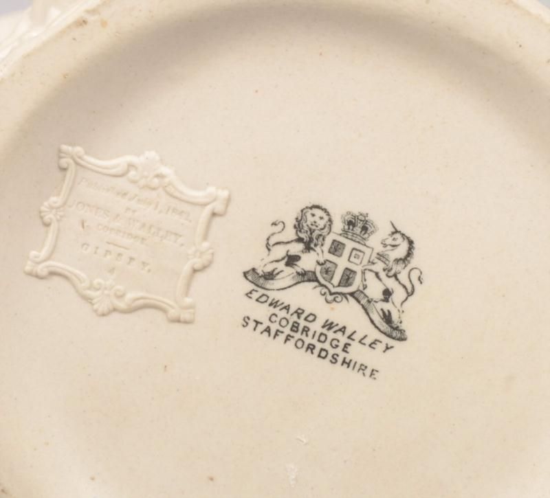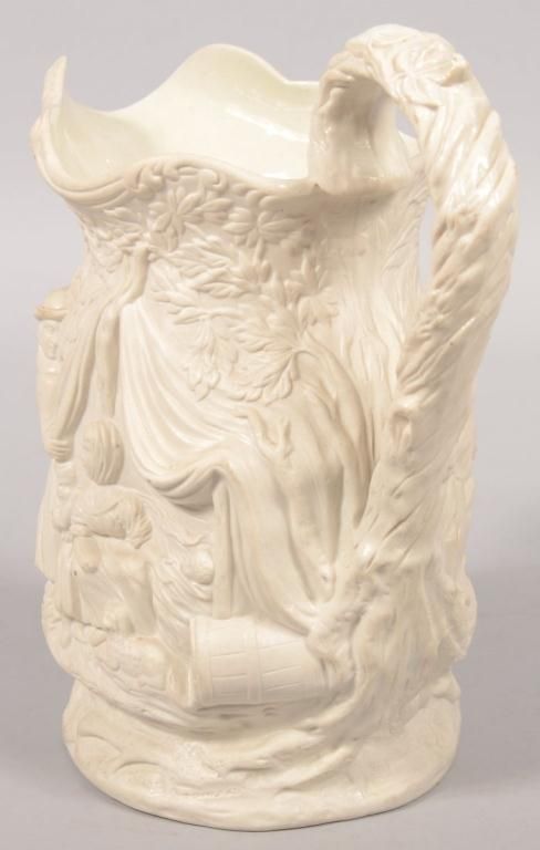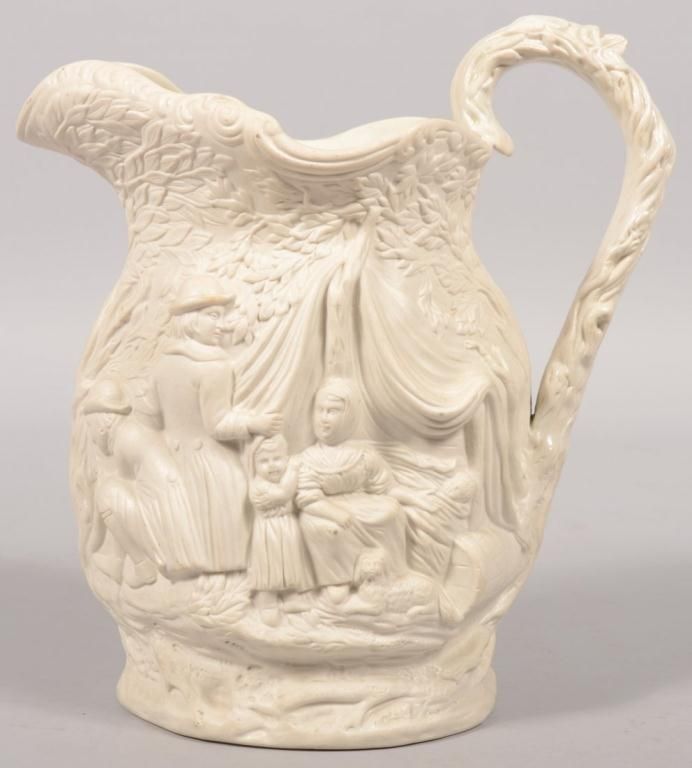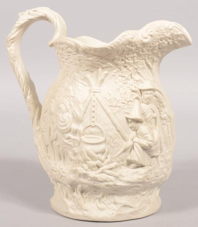 White Parian Pitcher. Relief design on body show a group of adults with one child camping in the woods. A tent on one side and a cook fire on the other. Vine loop handle. 10 1/2inh.