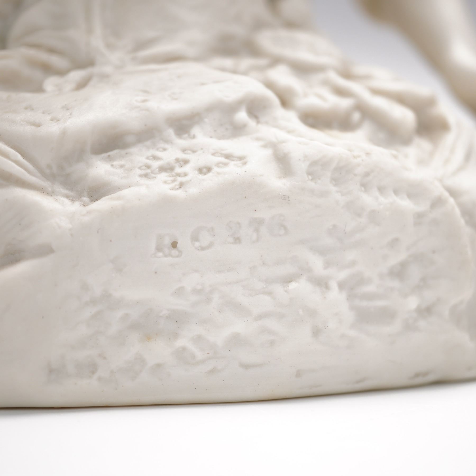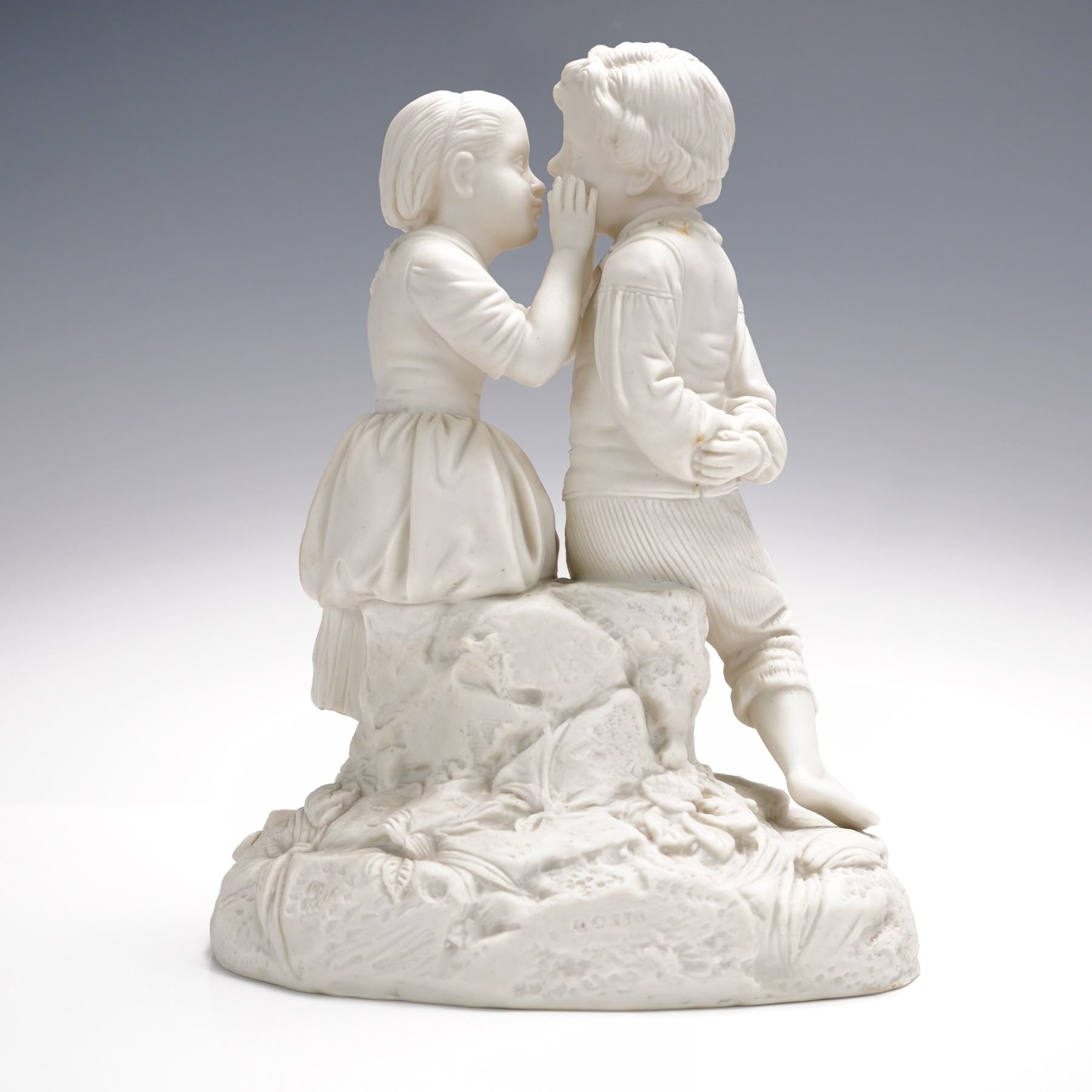 A charming 19th-century Parian ware figure titled "The Secret", depicting a young barefoot boy and girl in rustic dress seated on a rocky outcrop, as the girl whispers closely into the boy's ear. The composition is full of tender expression and fine textural detail, particularly in the drapery and base. Impressed to the back "R.C. 276", identifying the figure as part of a numbered series, likely by Robinson & Leadbeater, known for such sentimental figural groups. Hollow interior with open base.