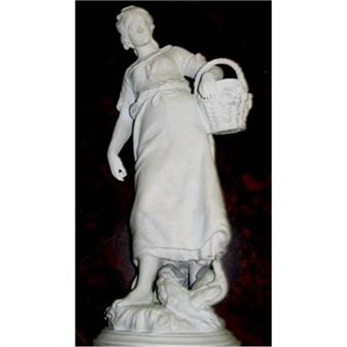 This beautiful young woman is carrying a basket. She is nicely detailed. It is made of parian ware, a porcelain first introduced in England in 1840. It is a fired but unglazed porcelain resembling Parian marble.