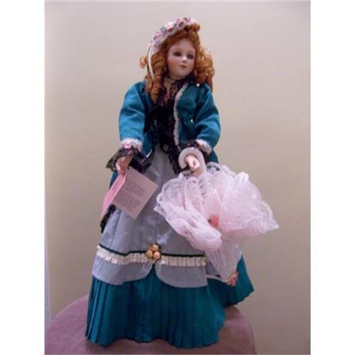 Kathleen is an Irish porcelain beauty! Made by Paradise Galleries, this doll has a Certificate of Authenticity signed by the artist Cindy Shafer, Numbered C167, and in her original box. All that and more... besides her beautifully detailed dress, this doll is musical and plays "When Irish Eyes Are Smiling", as part of the Music & Memories Collection. Please note, the umbrella is supposed to be over her head, but I don't like to fool around with these dolls too much since they've not been on display before. If you need more information, please contact me by e-mail. Thanks for looking!
