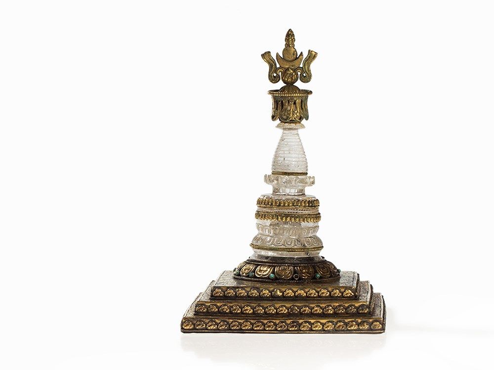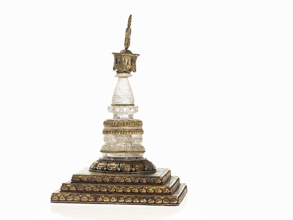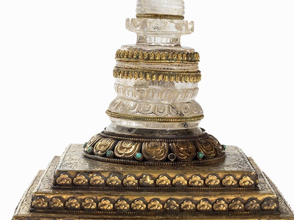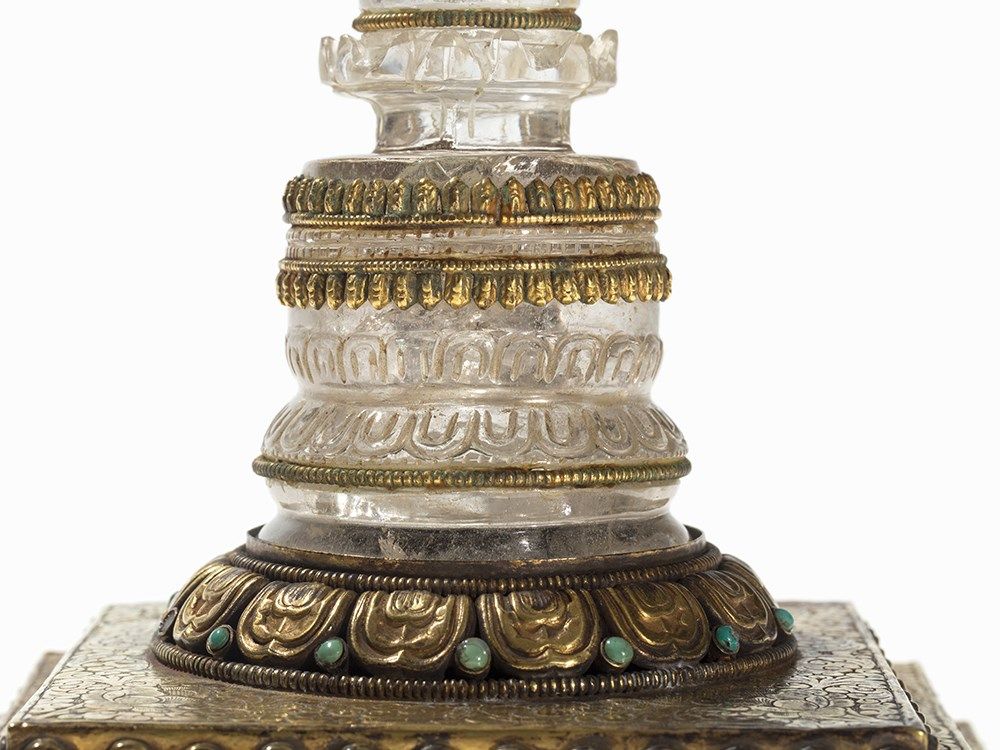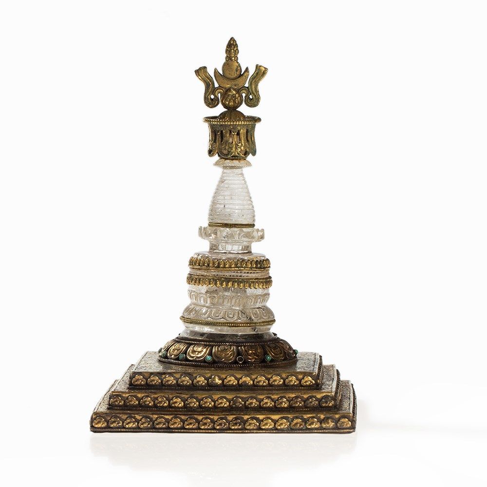 This parinirvana stupa was made of rock crystal and is adorned with gilt mountings. The stupa stands on a three-step base of gilt copper and is adorned with small round turquois inlays. The base is decorated with engraved lotus decor and flowers in relief. In Buddhism, the lotus is the symbol of purity and mental clarity. The word parinirvana roughly means ‘total termination’, in the sense of a complete nirvana. The finely chased stupa tapers upwards and is crowned with an open work canopy with crescent moon and sun. The base of the parinirvana stupa is sealed with a copper plate with a double vajra symbol.
