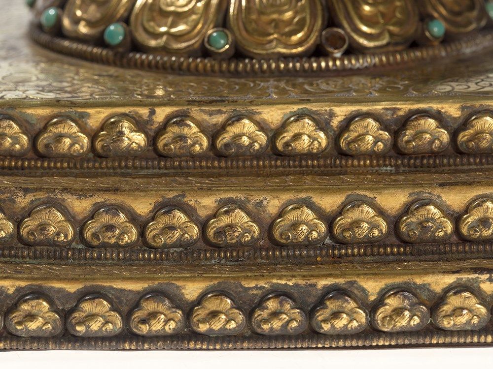 The Stupa is in very good condition with natural patina and slight signs of age and wear such as missing inlays and little gold wear. With base it is 28 cm tall and the width as well was the depth measures 18.5 cm.