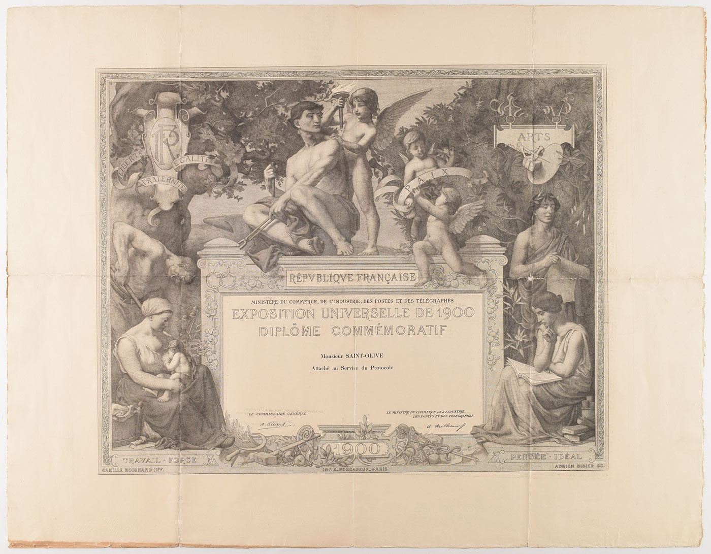Scarce official commemorative diploma from the Paris 1900 Exposition Universelle (of which the Summer Olympics were a part), 29.5 x 23, issued by the Department of Commerce, Post and Telegraph Industry and presented to Mr. Saint-Olive, Attache to the Protocol Service. In very good to fine, folded condition, with toning to the bottom edge, and splitting to intersecting folds.