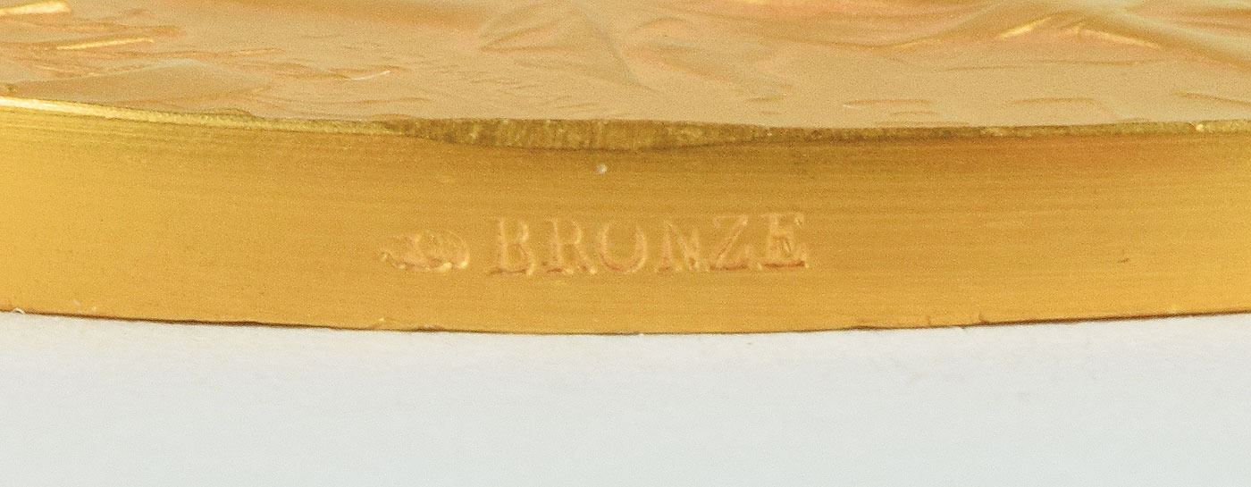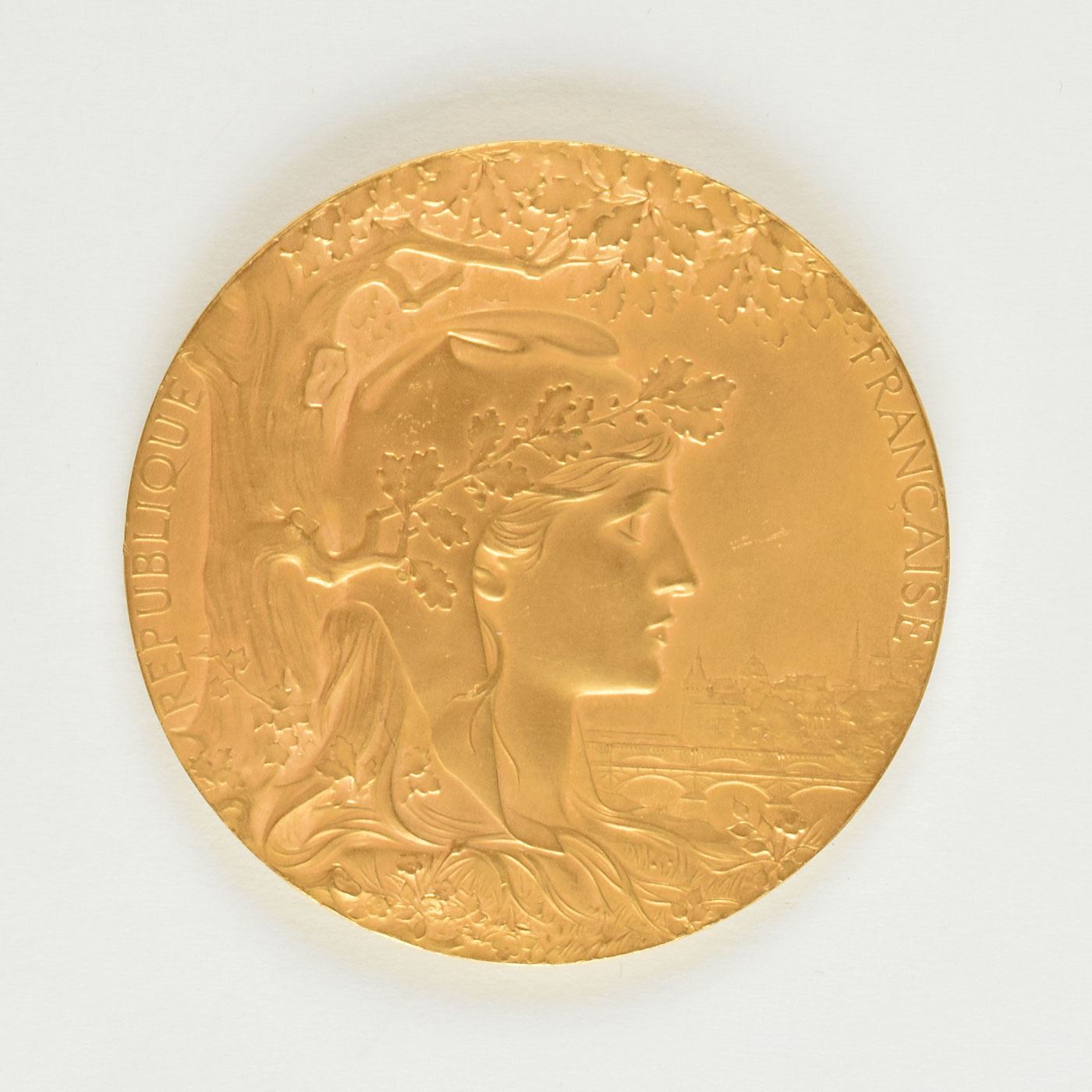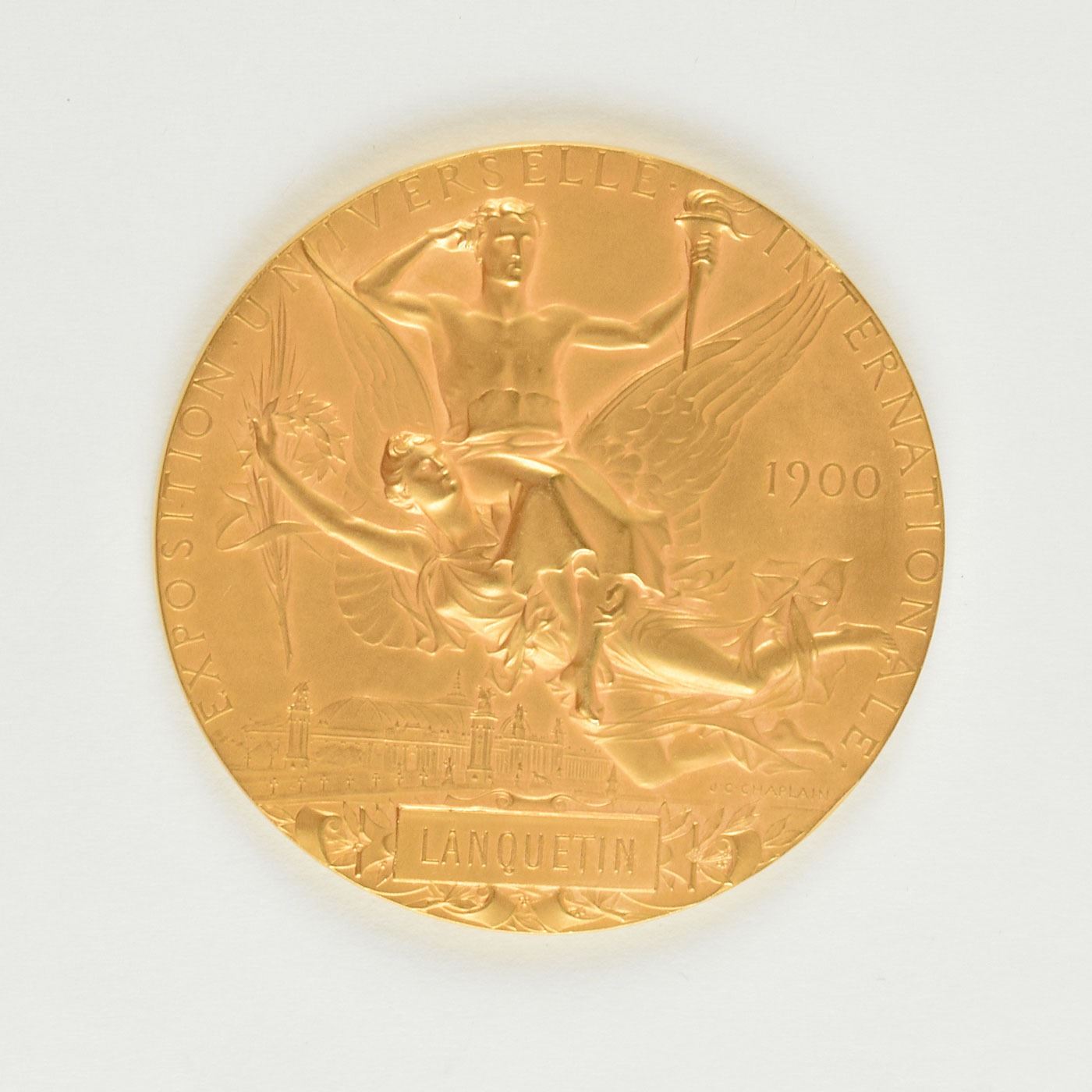 Gorgeous non-athletic award medal from the Paris 1900 Exposition Universelle Internationale, which played host to that year's Summer Olympics. Gilt bronze, 63.5 mm, 102 gm, by Jules-Clement Chaplain. The front depicts a profile view of Marianne, the national symbol of the French Republic; the reverse bears an athlete with a torch riding on the back of Nike, the goddess of victory, with tablet reading "Lanquetin." Stamped on the edge with the Paris mint's cornucopia symbol and "Bronze." Since this Olympics did not issue participation medals, these non-athletic award medals are used as a placeholder in participation medal collections. With its brilliant Art Nouveau style, this uncommon award exists as one of the most aesthetically pleasing of all Olympic-related medals.