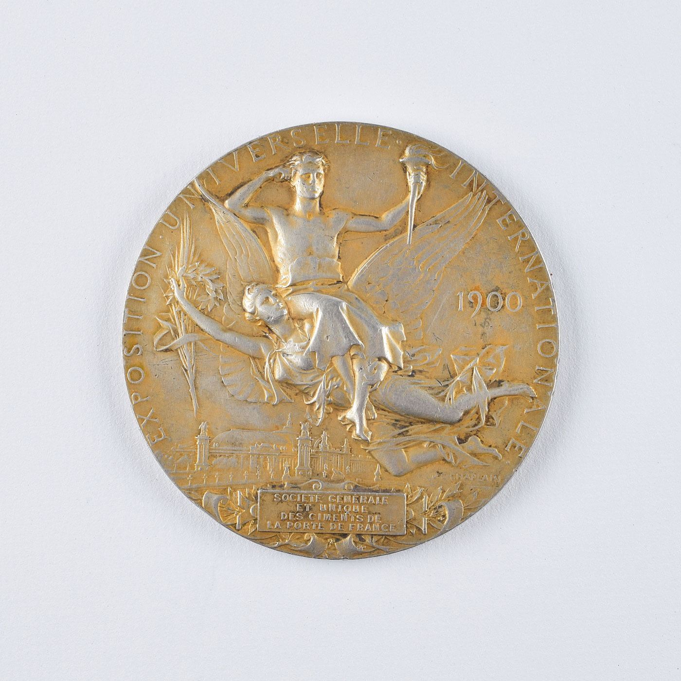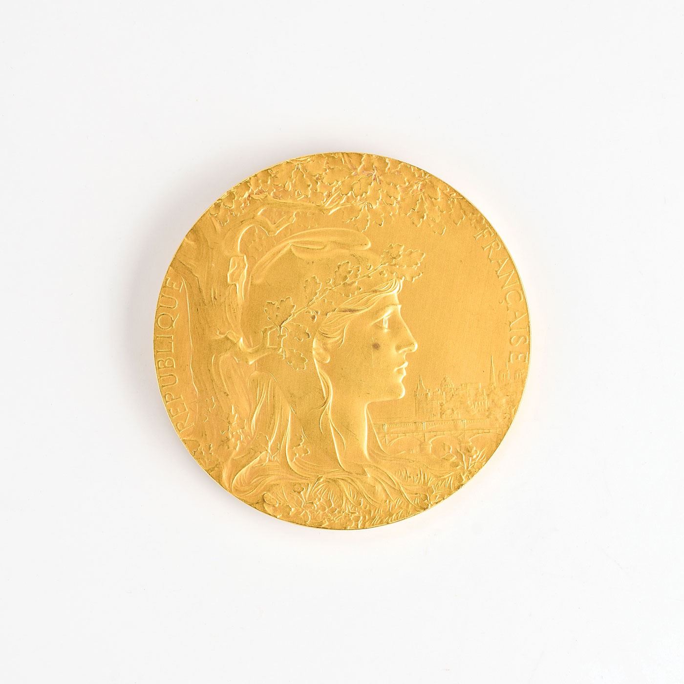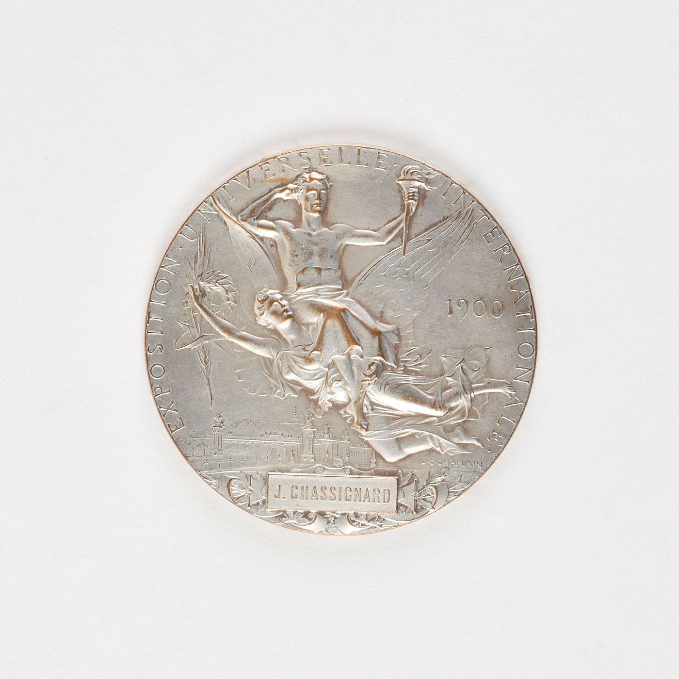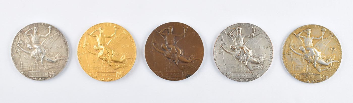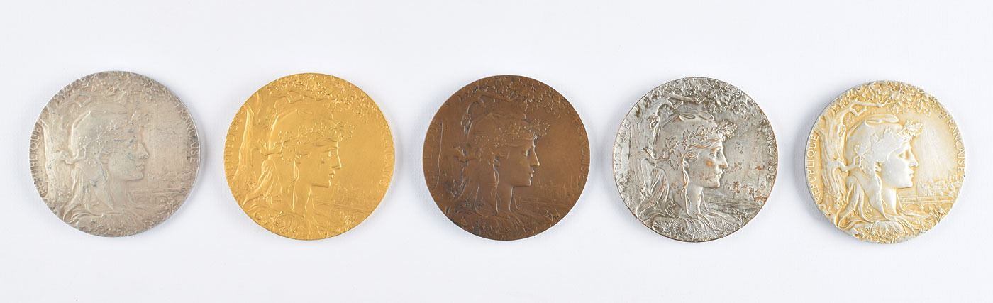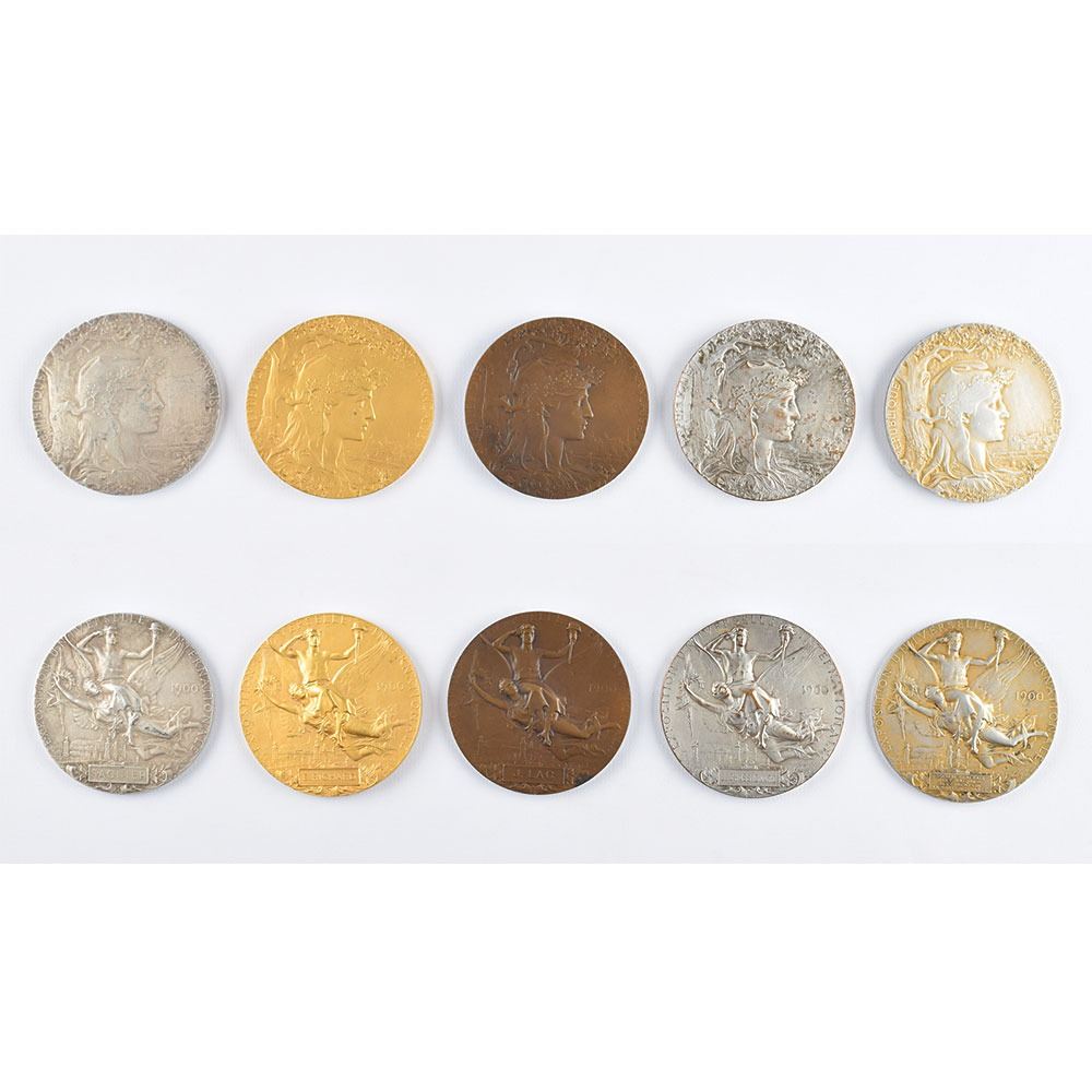 Rare complete set of the five variations of non-athletic award medals issued for the Paris 1900 Exposition Universelle Internationale, which played host to that year's Summer Olympics, featuring a gorgeous design by Jules-Clement Chaplain. Includes the bronze medal, silvered bronze medal, gilt bronze medal, solid silver medal, and gilt silver medal (with original leather presentation case and slip). Each measures 63.5 mm in diameter. The fronts depict a profile view of Marianne, the national symbol of the French Republic; the reverses bear an athlete with a torch riding on the back of Nike, the goddess of victory. Each is stamped on the edge with the Paris mint's cornucopia symbol and metal type. Since this Olympics did not issue participation medals, these non-athletic award medals are used as a placeholder in participation medal collections. With their brilliant Art Nouveau style, these uncommon awards exist as some of the most aesthetically pleasing of all Olympic-related medals.