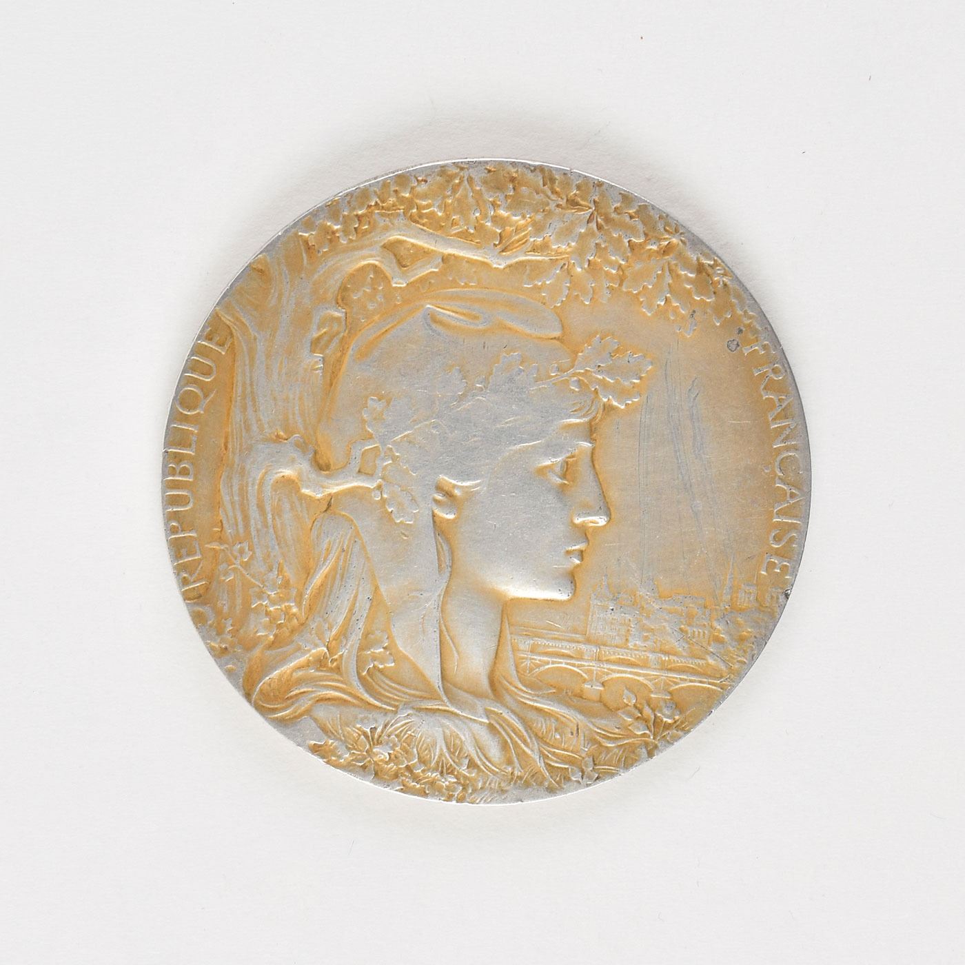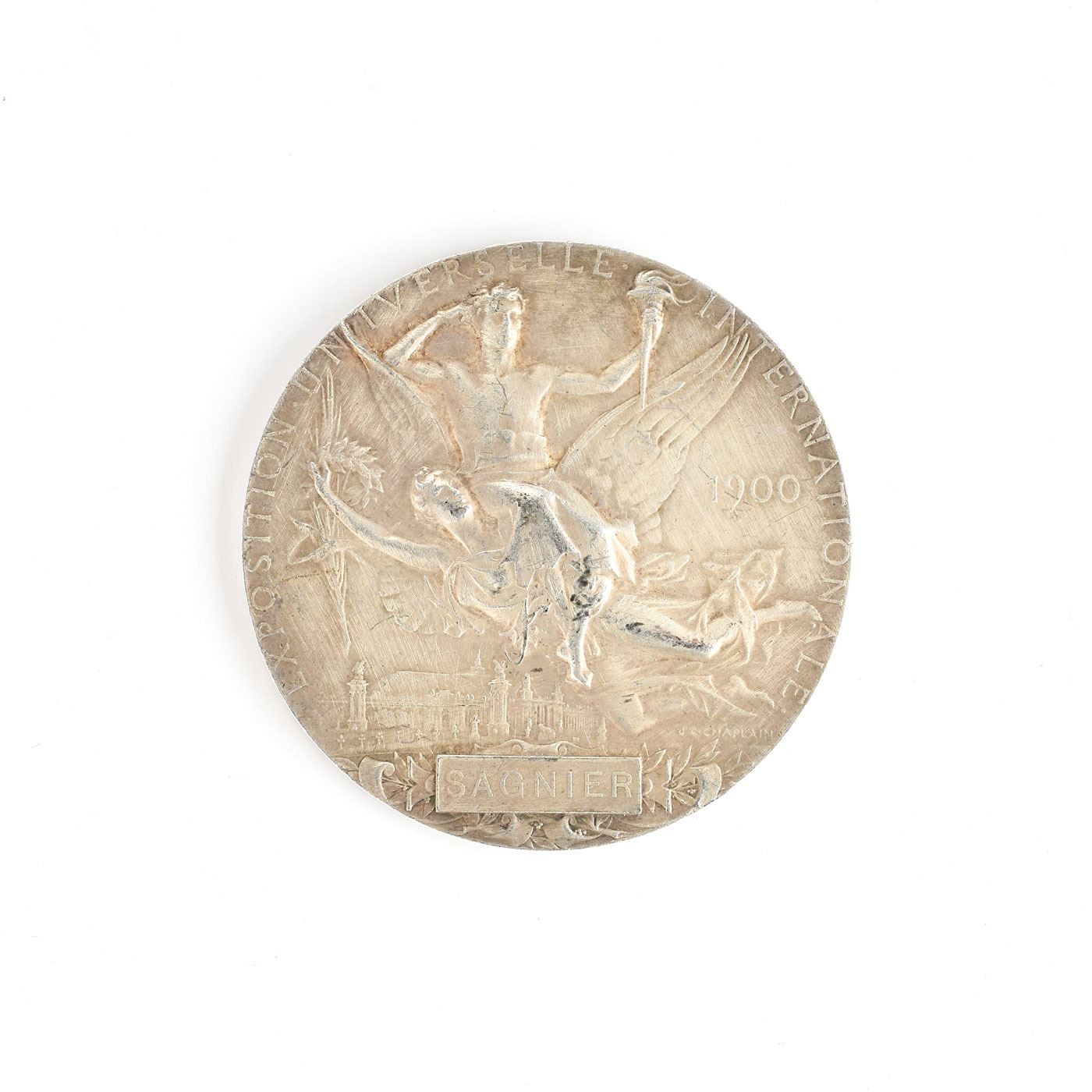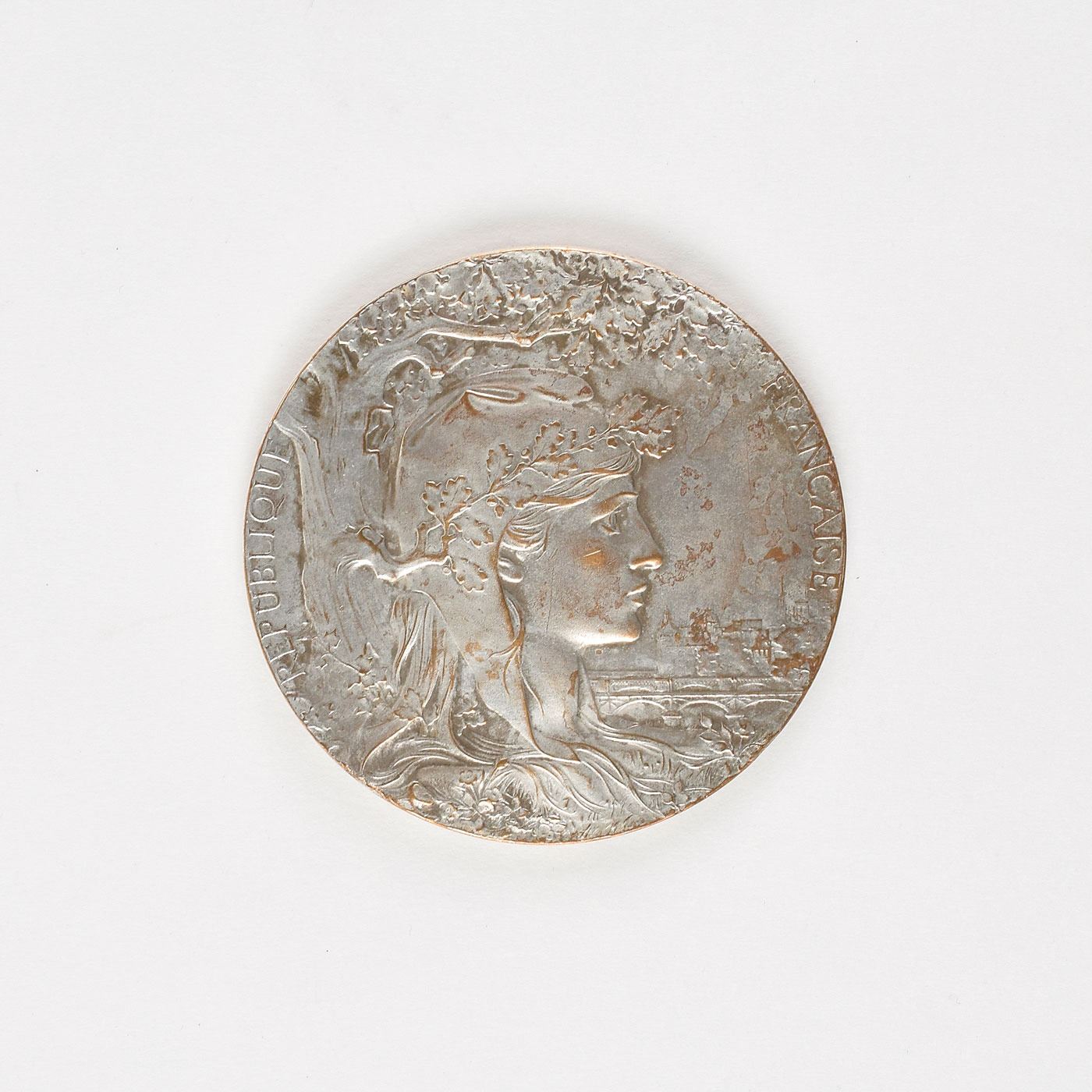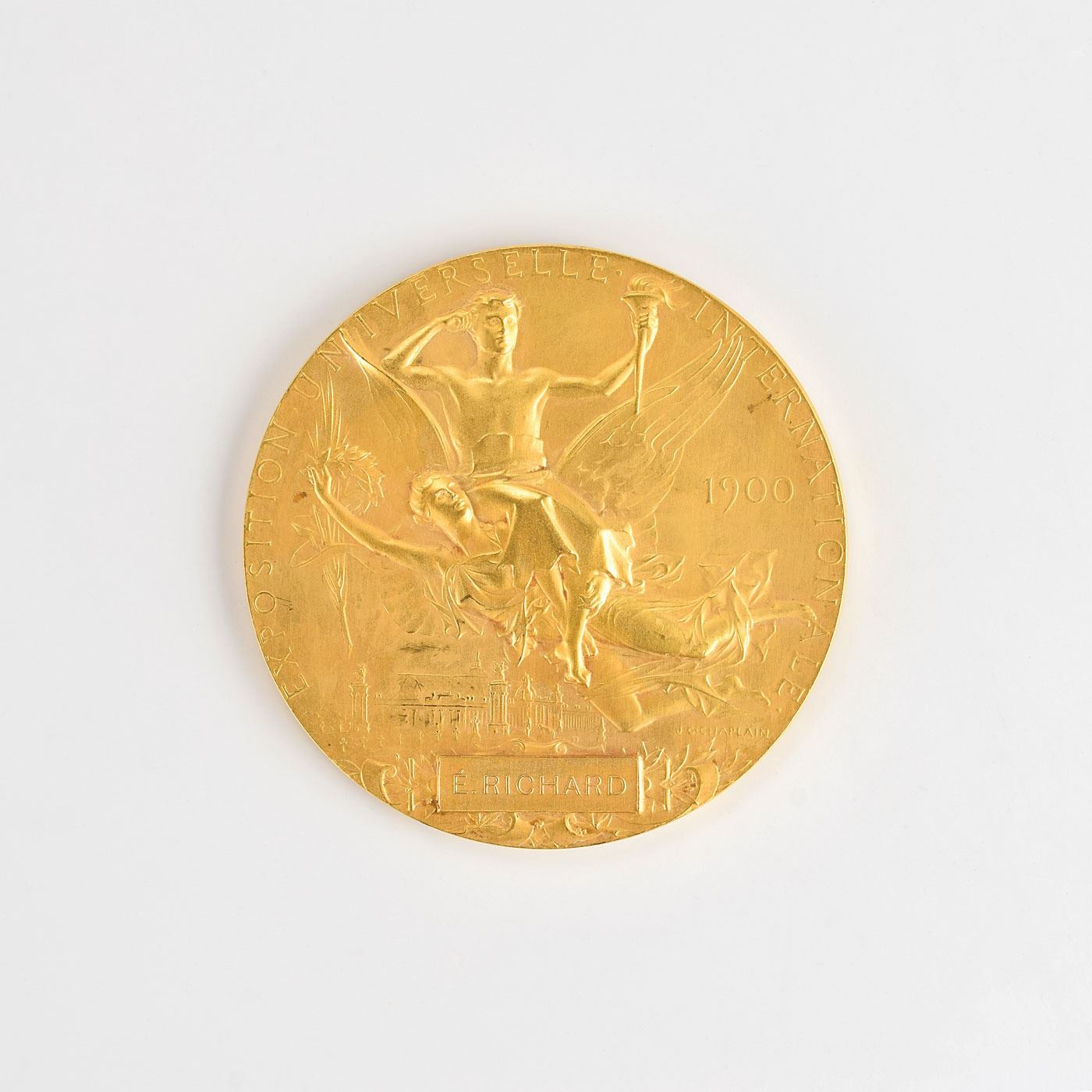 Rare complete set of the five variations of non-athletic award medals issued for the Paris 1900 Exposition Universelle Internationale, which played host to that year's Summer Olympics, featuring a gorgeous design by Jules-Clement Chaplain. Includes the bronze medal, silvered bronze medal, gilt bronze medal, solid silver medal, and gilt silver medal (with original leather presentation case and slip). Each measures 63.5 mm in diameter. The fronts depict a profile view of Marianne, the national symbol of the French Republic; the reverses bear an athlete with a torch riding on the back of Nike, the goddess of victory. Each is stamped on the edge with the Paris mint's cornucopia symbol and metal type. Since this Olympics did not issue participation medals, these non-athletic award medals are used as a placeholder in participation medal collections. With their brilliant Art Nouveau style, these uncommon awards exist as some of the most aesthetically pleasing of all Olympic-related medals.