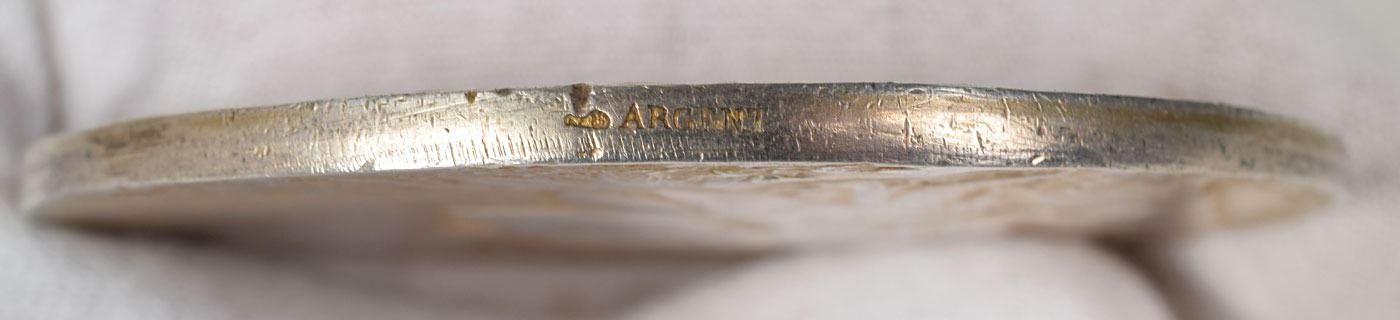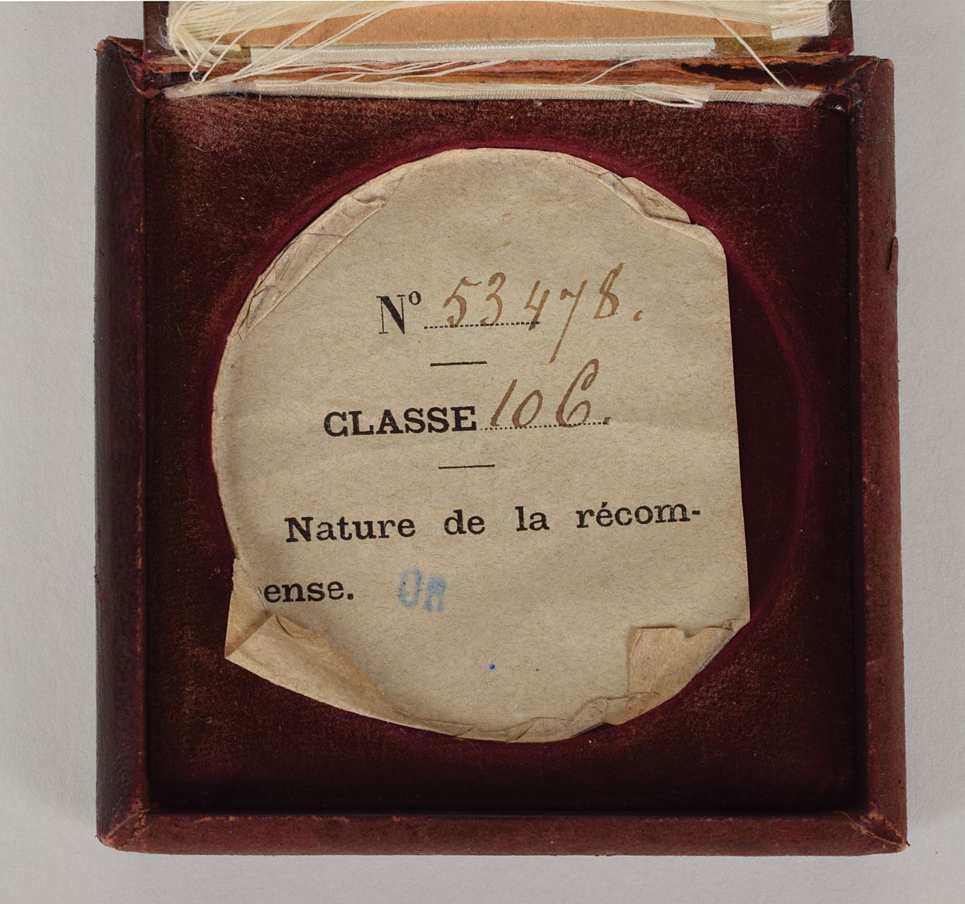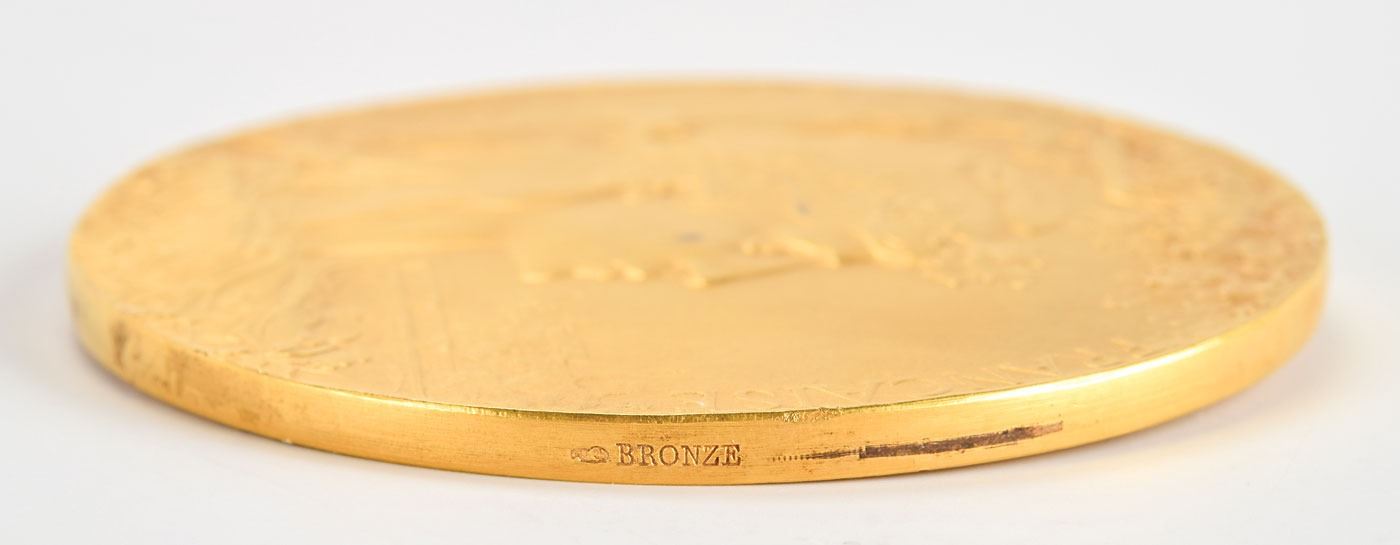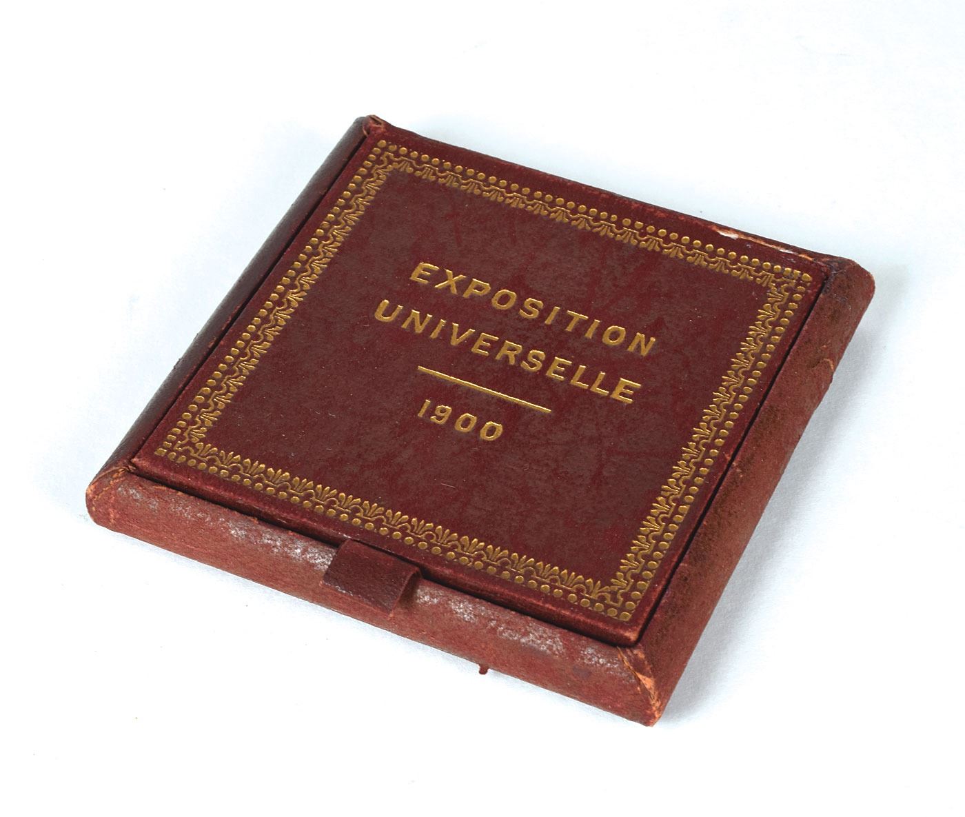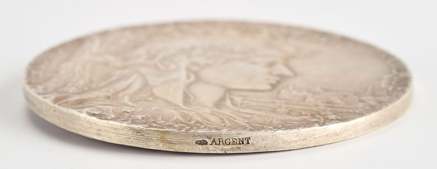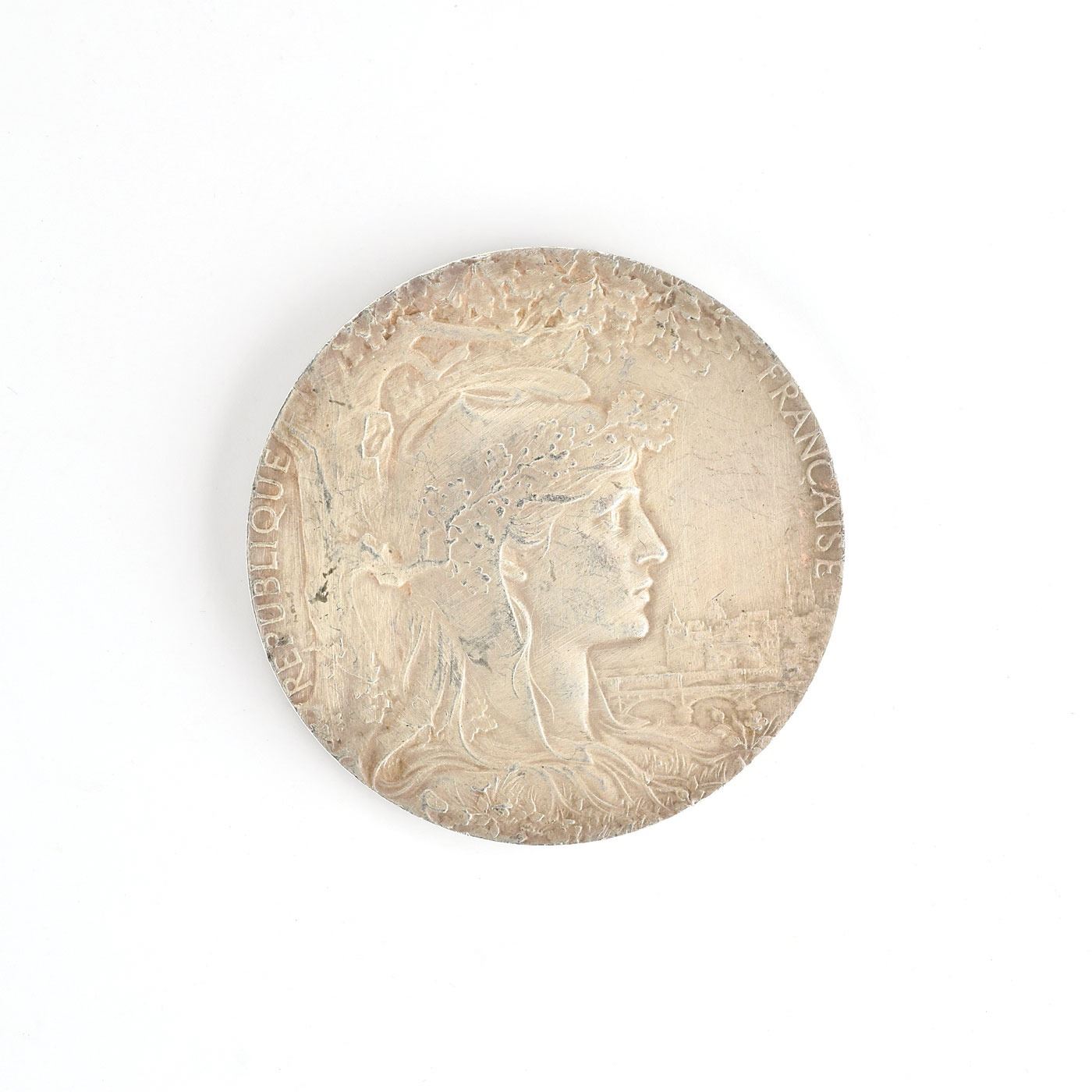 Rare complete set of the five variations of non-athletic award medals issued for the Paris 1900 Exposition Universelle Internationale, which played host to that year's Summer Olympics, featuring a gorgeous design by Jules-Clement Chaplain. Includes the bronze medal, silvered bronze medal, gilt bronze medal, solid silver medal, and gilt silver medal (with original leather presentation case and slip). Each measures 63.5 mm in diameter. The fronts depict a profile view of Marianne, the national symbol of the French Republic; the reverses bear an athlete with a torch riding on the back of Nike, the goddess of victory. Each is stamped on the edge with the Paris mint's cornucopia symbol and metal type. Since this Olympics did not issue participation medals, these non-athletic award medals are used as a placeholder in participation medal collections. With their brilliant Art Nouveau style, these uncommon awards exist as some of the most aesthetically pleasing of all Olympic-related medals.