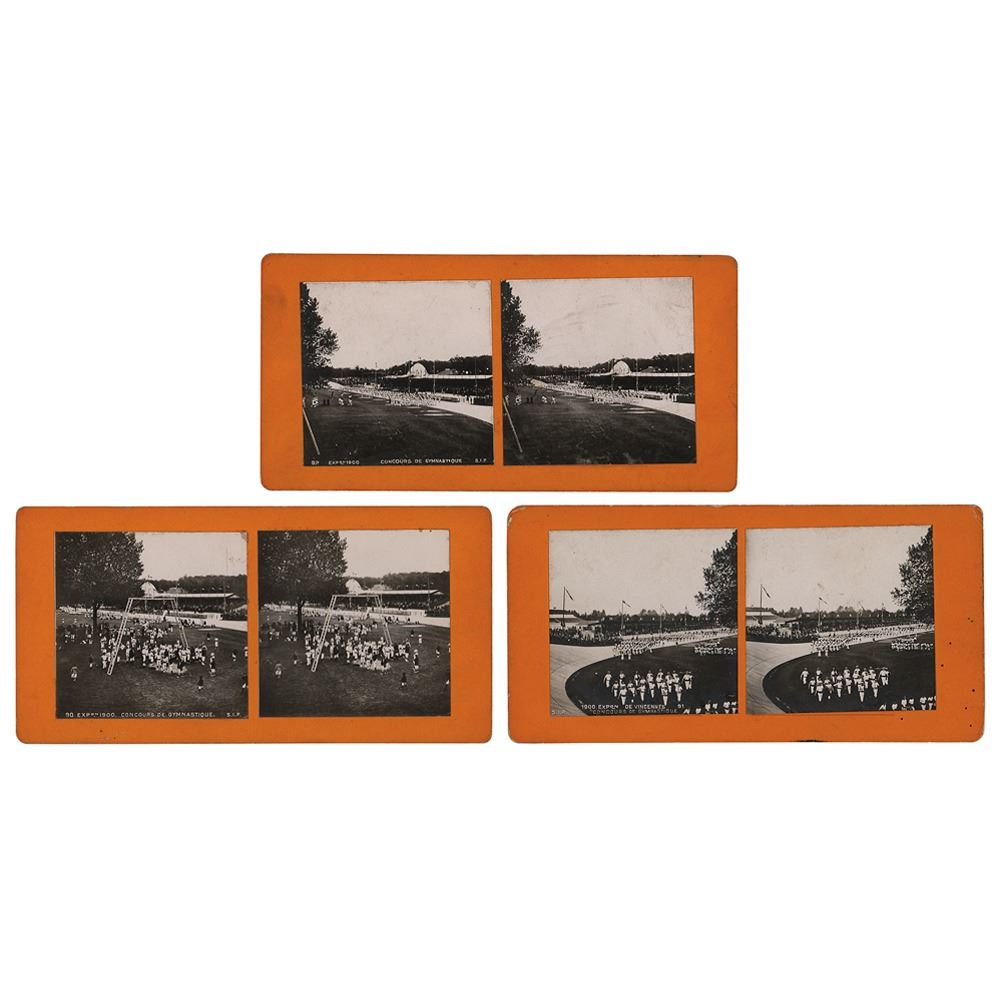Three stereoscopic photograph cards from the Paris 1900 Olympics, each measuring 7 x 3.5 and containing two stereo images from the ‘Concours de Gymnastique’ or gymnastics competition. In overall fine condition, with some light scuffs and spotting.
