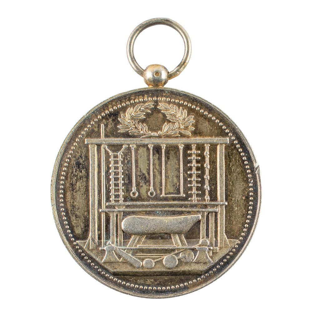 Unusual participation medal issued for gymnastics at the Paris 1900 Olympics. Silvered bronze, 44 mm, 33 gm. The front depicts an embossed laurel branch with raised text in French (translated): “Patronage and Youth Work, International Gymnastics Competition, 1900â€; and the reverse features a laurel wreath over a variety of exercise and gymnastics equipment. The medal bears some light marks and areas of discoloration.